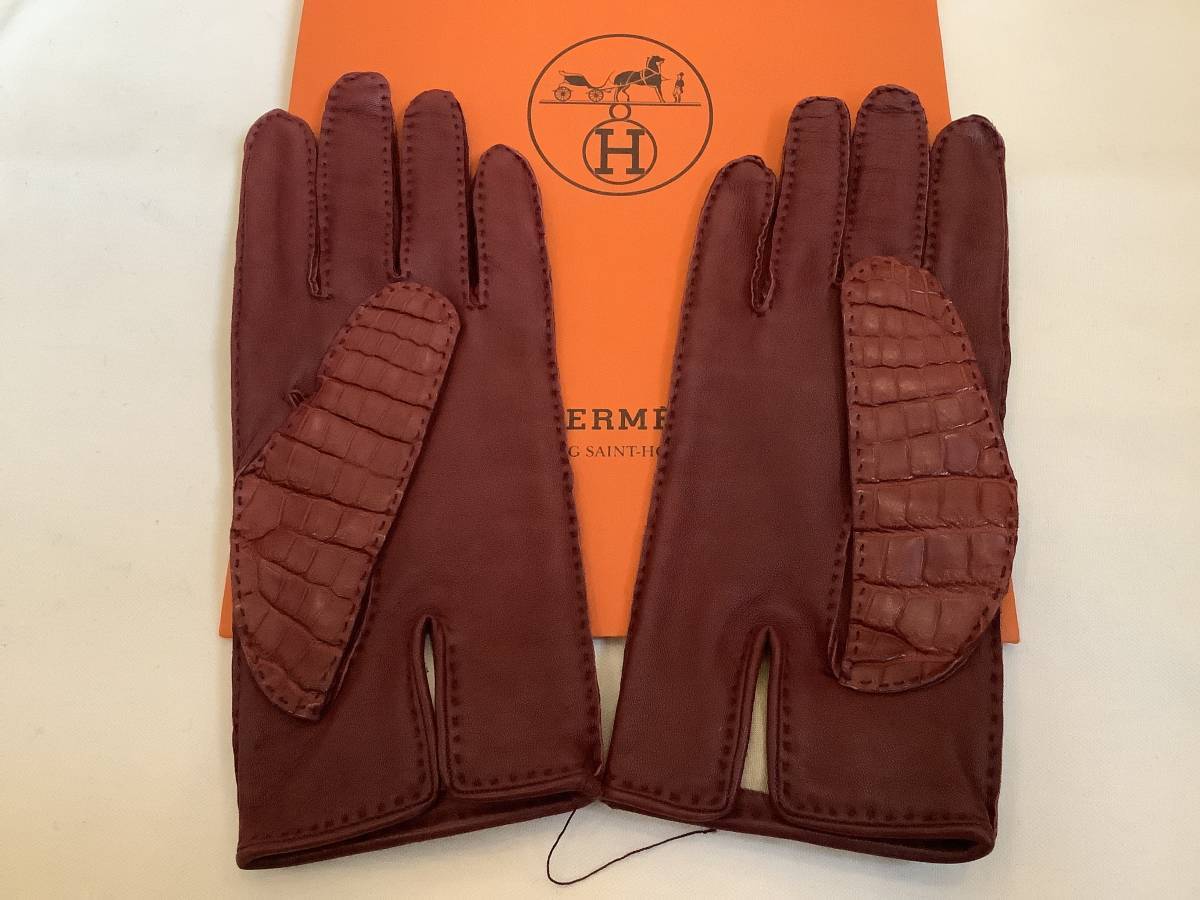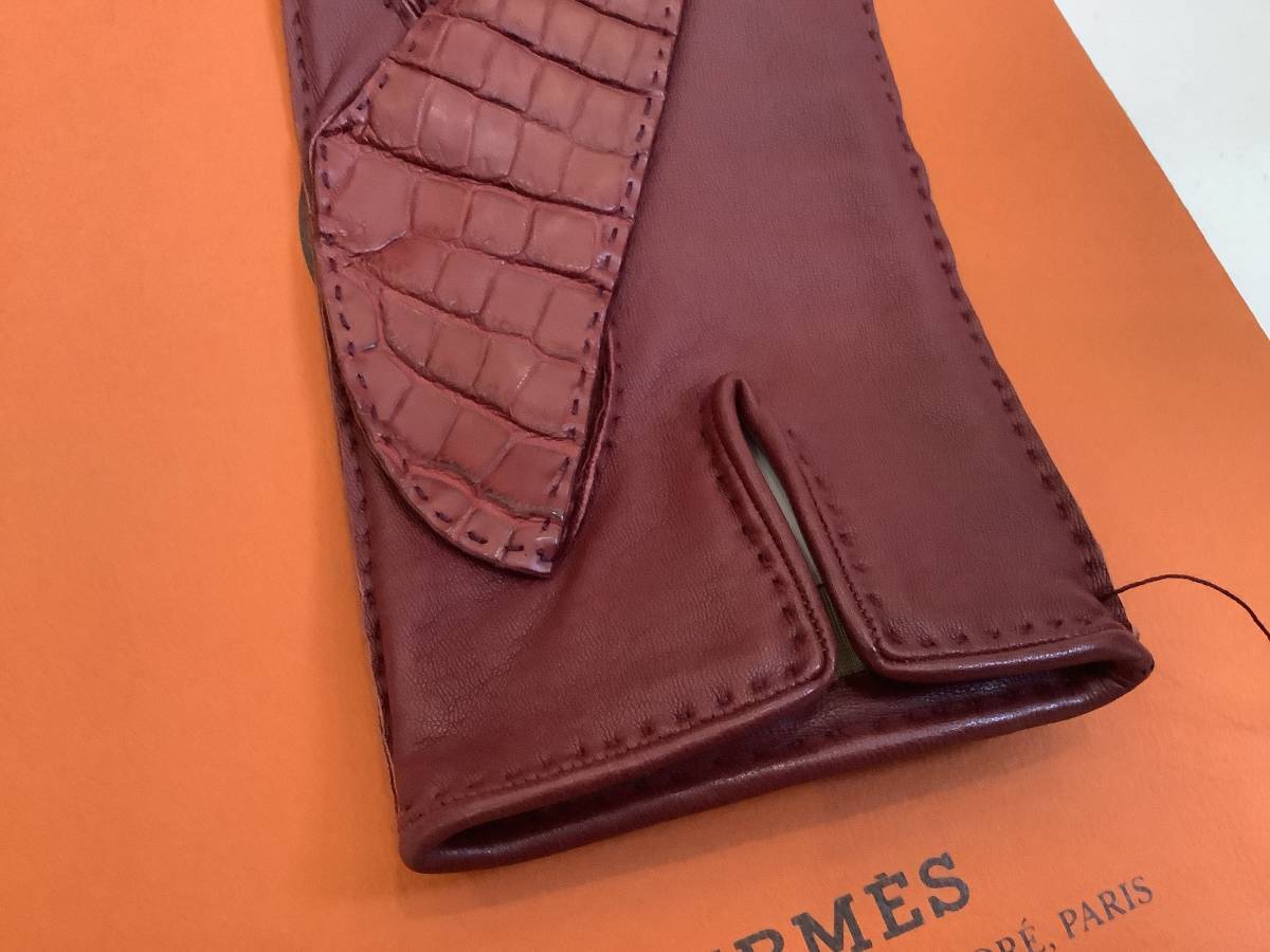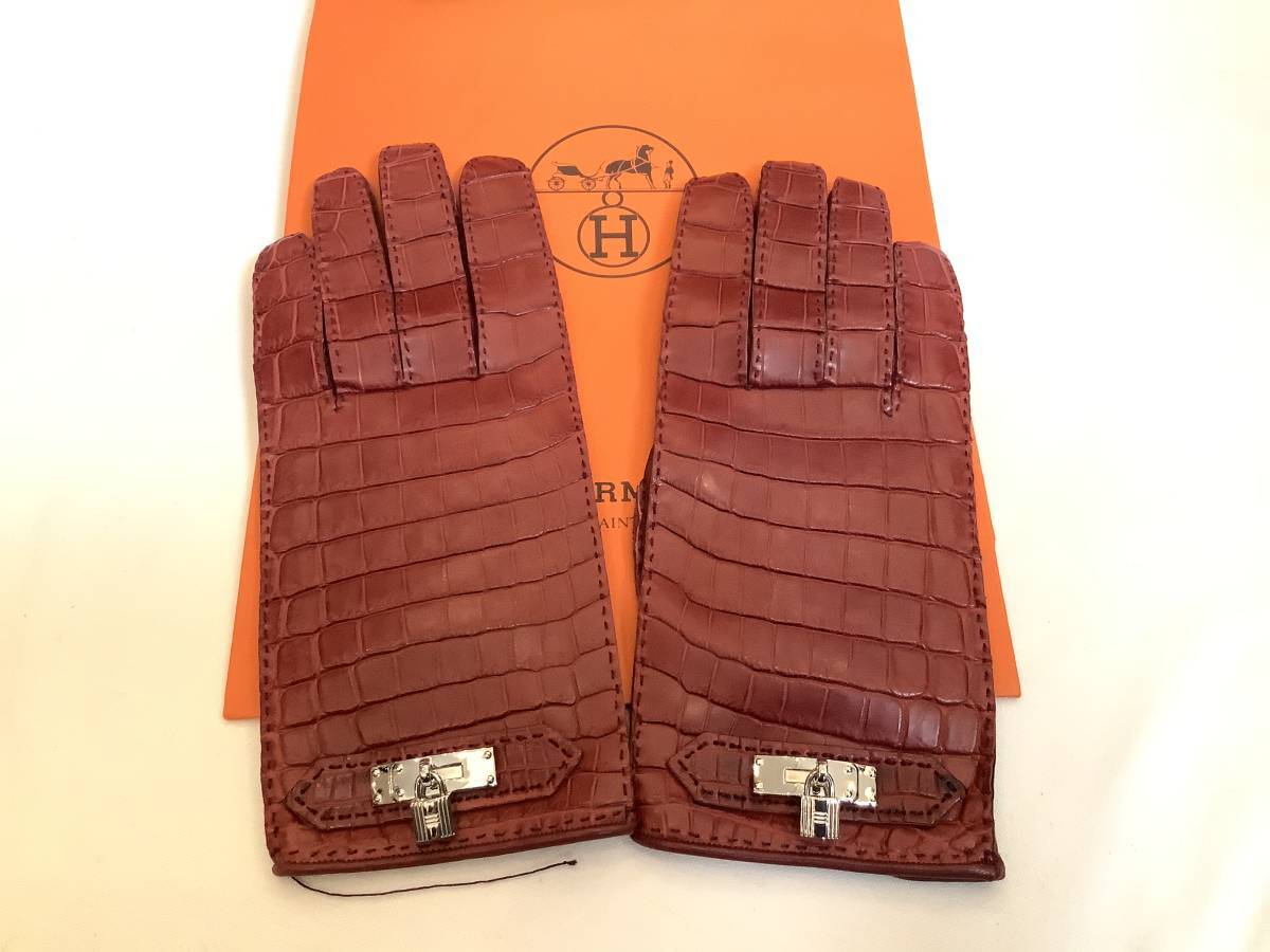 即決 新品 本物 HERMES エルメス リアル クロコ クロコダイル 希少 レア シルバー色金具 ケリー カデナ グローブ GROVE 手袋 ボルドー 7.5