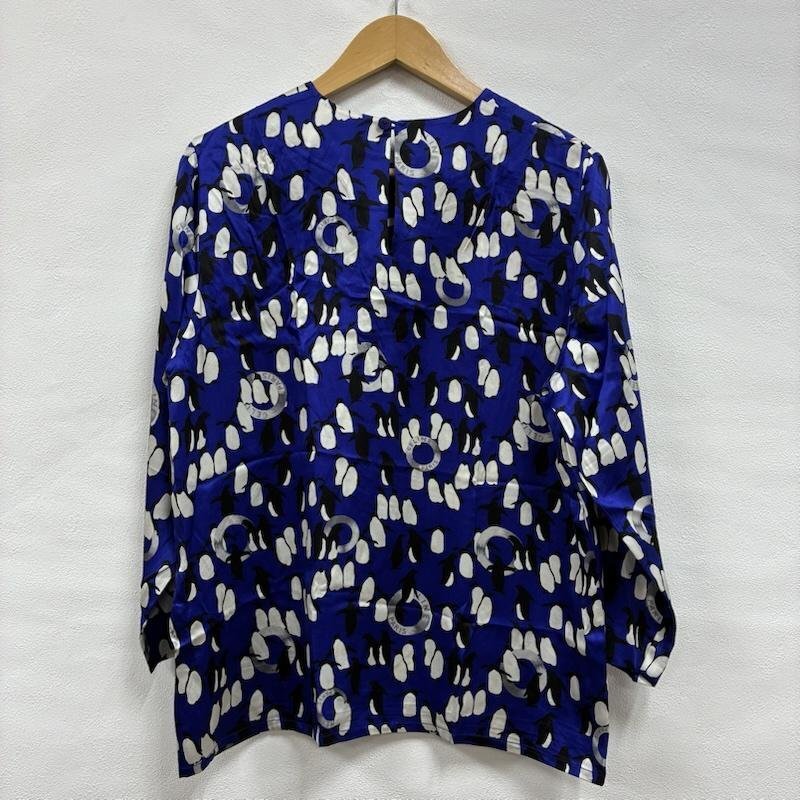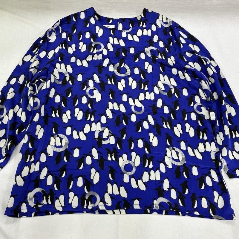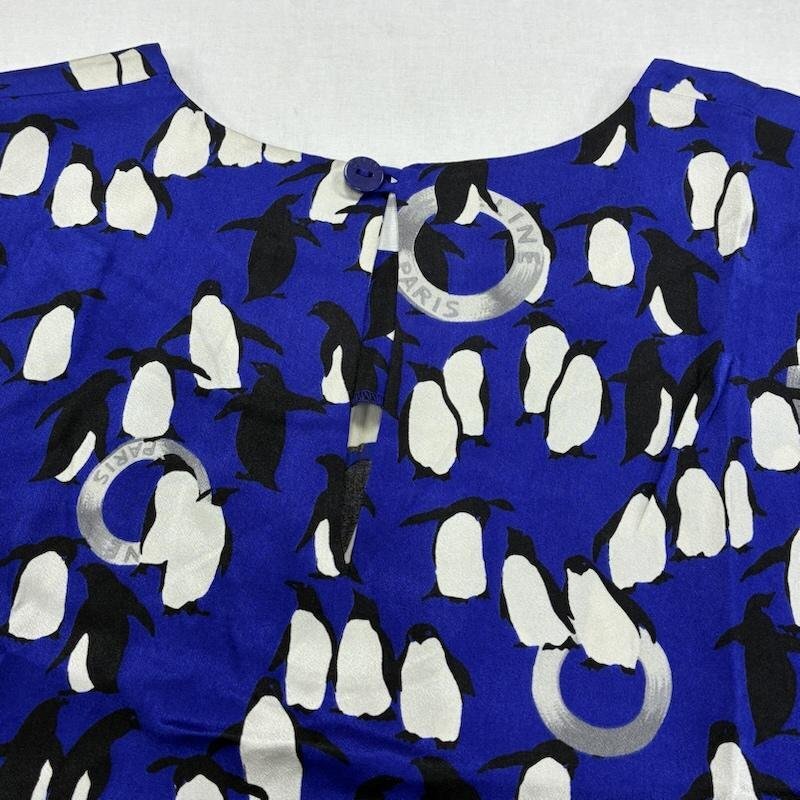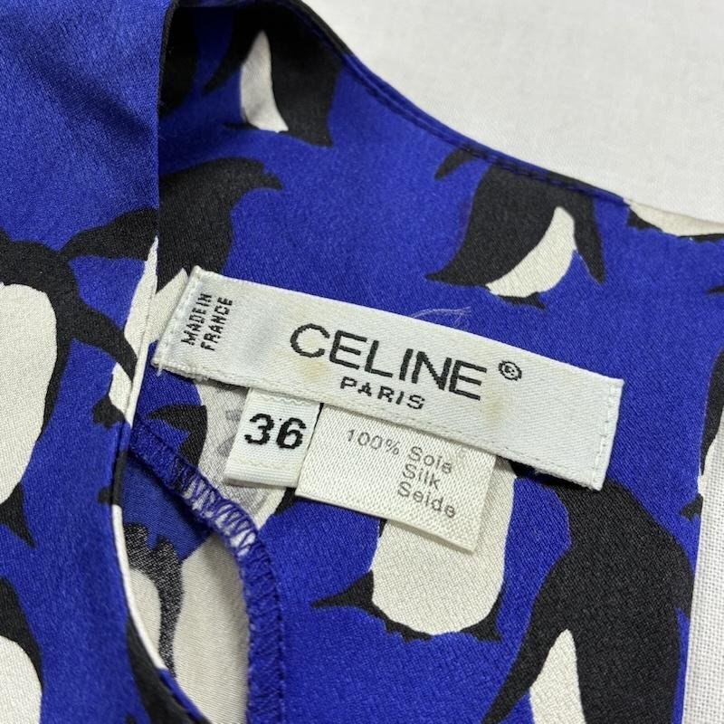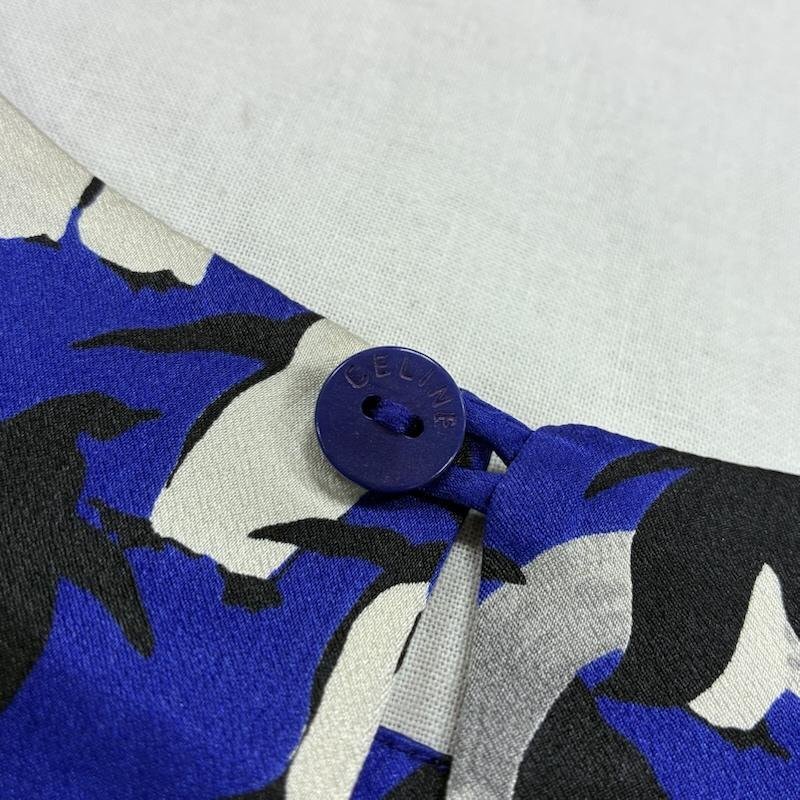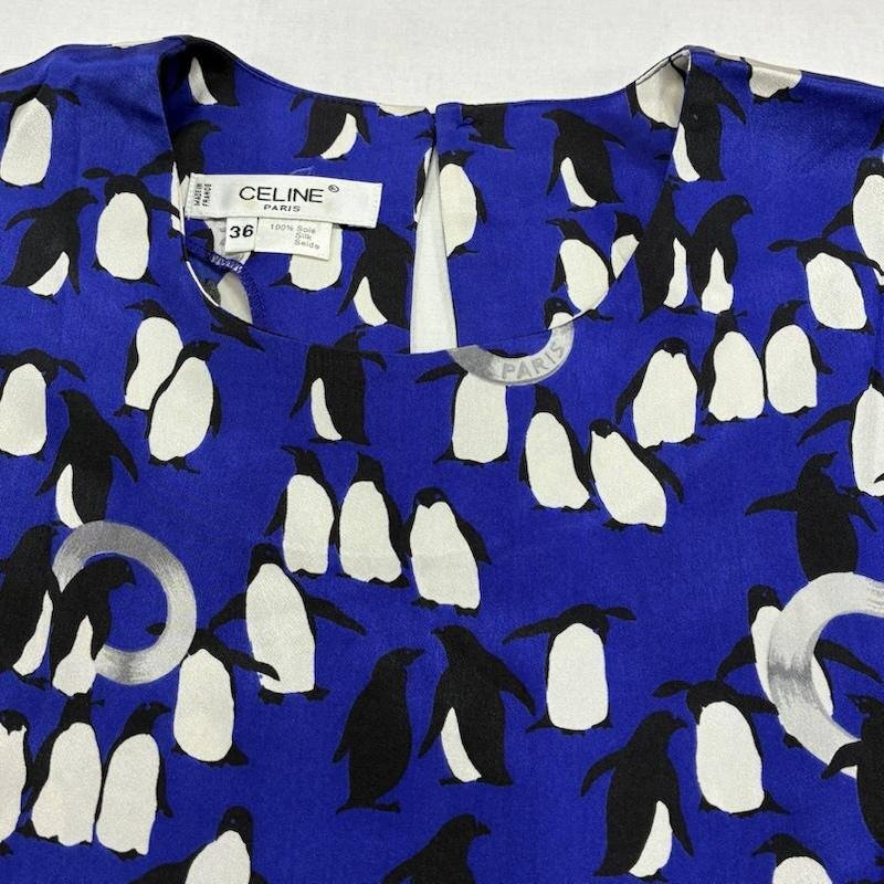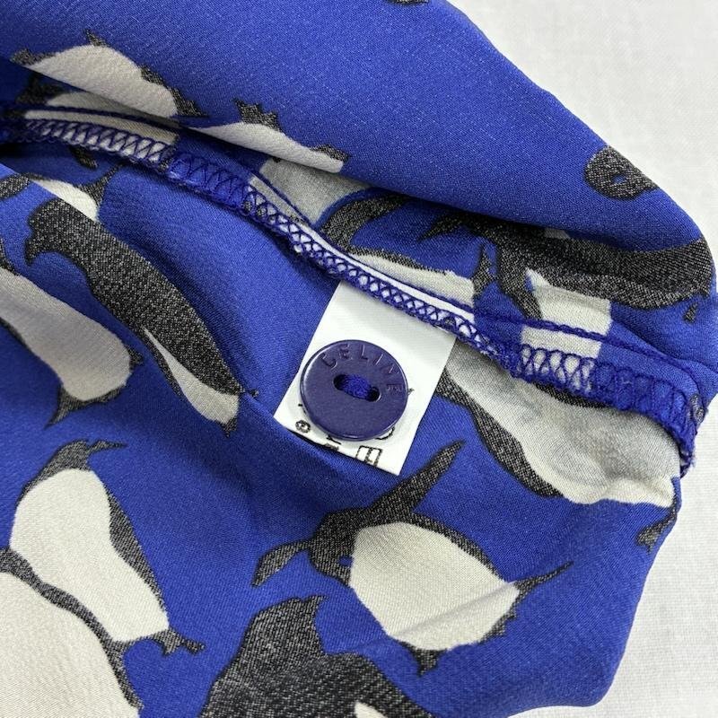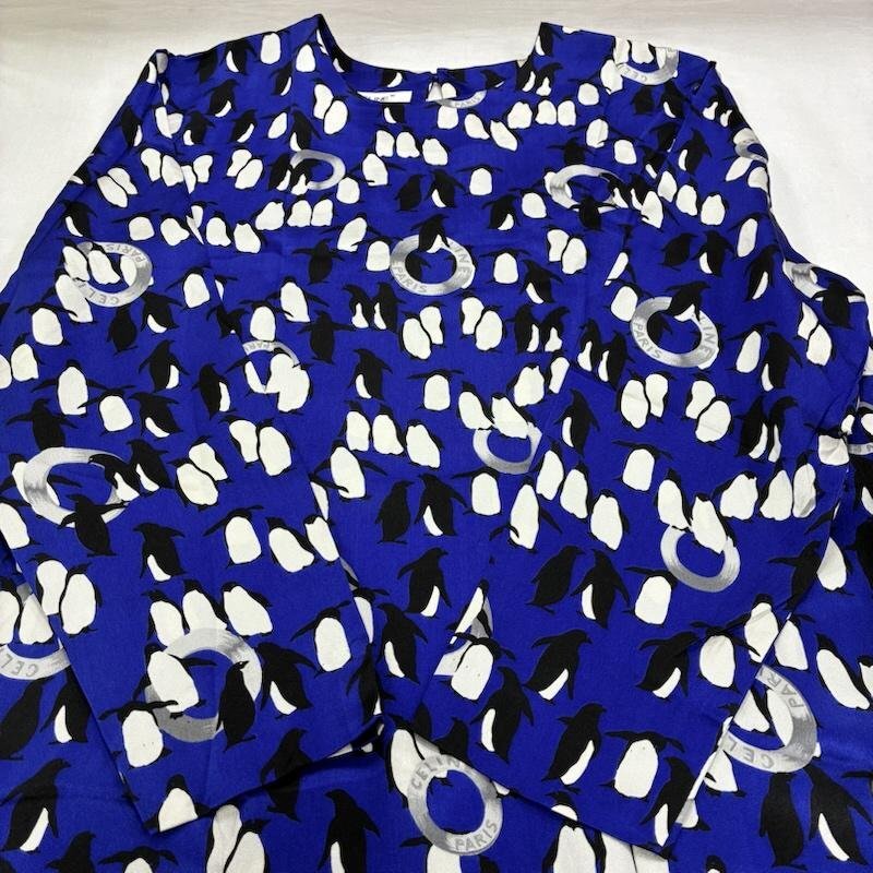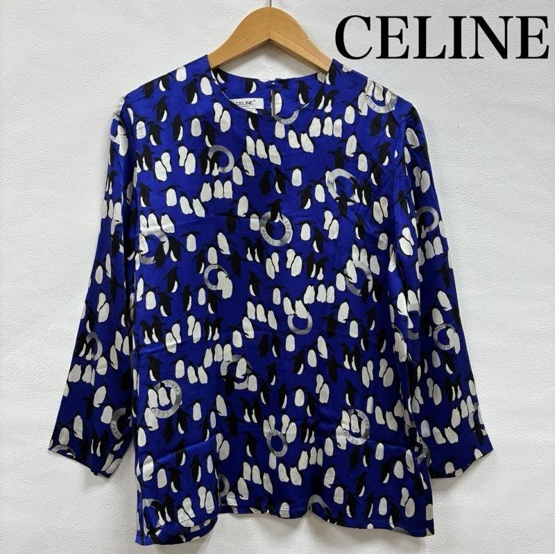 セリーヌ フランス製 サークル ロゴ ペンギン 総柄 シルク ノーカラー ブラウス 36