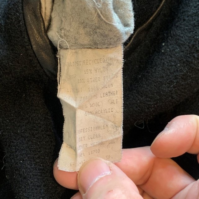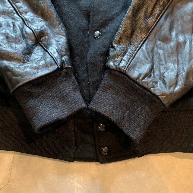 ★商品状態★ ・着用感があり、比較的目立ちにくいですが右下腹部に小穴のダメージリペアが3カ所程度見られます。 ・古着慣れされている方でしたら問題なく着用していただける程度かと思います。 ・MADE IN USA ★素材★ ウール×レザー ★配色★ ブラック ★サイズ表記★ XL ・実寸を参考にして下さい。 ★実寸サイズ★ 肩幅49㎝ 身幅63㎝(脇下~脇下) 着丈70㎝(襟下~裾) 袖丈59㎝(肩~袖先) ・平置きにての採寸となります。 ・若干の誤差はご了承ください。 |