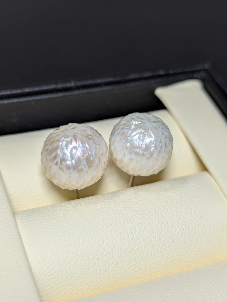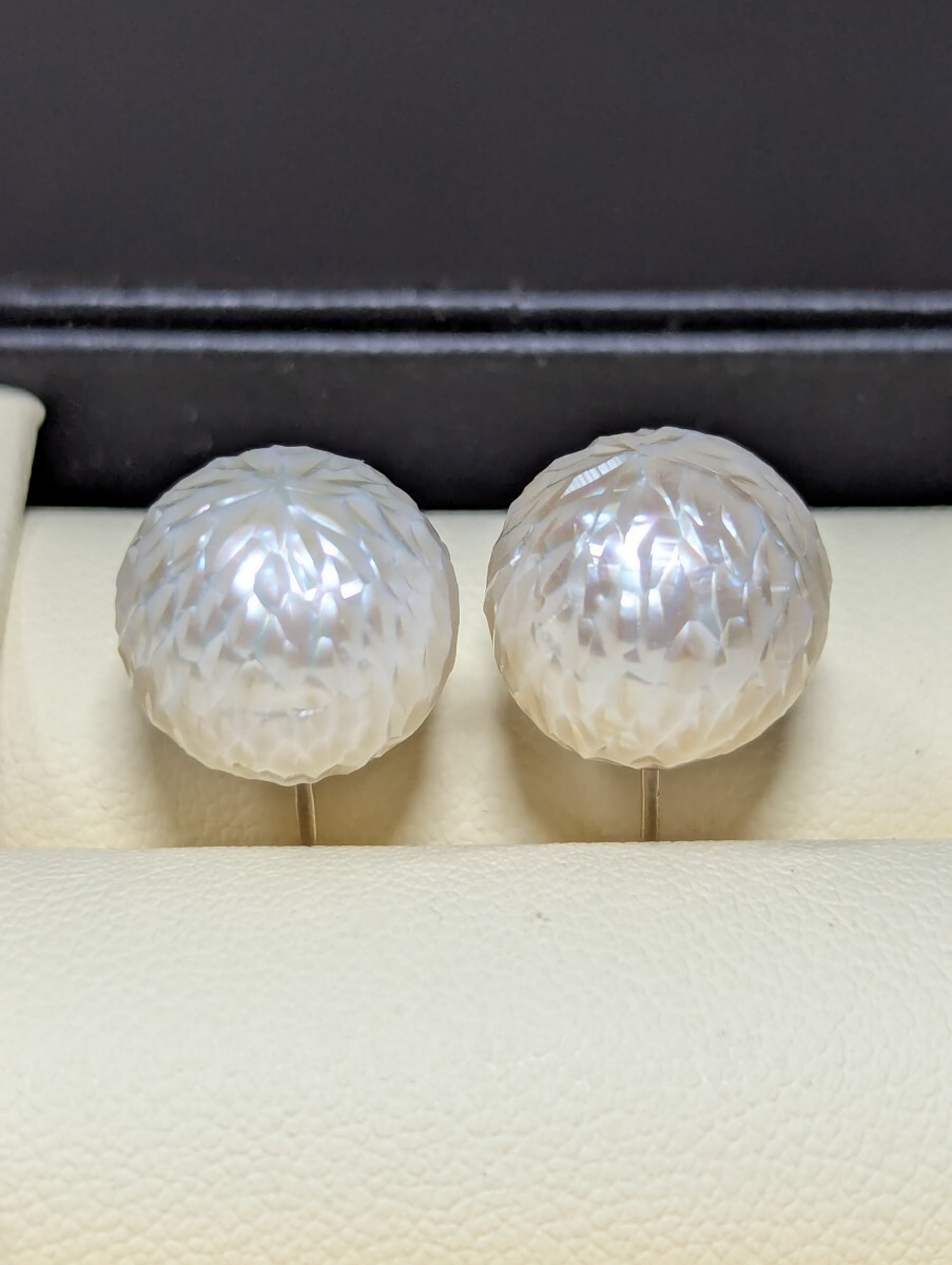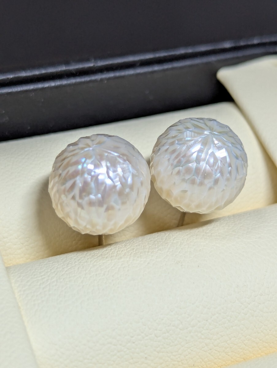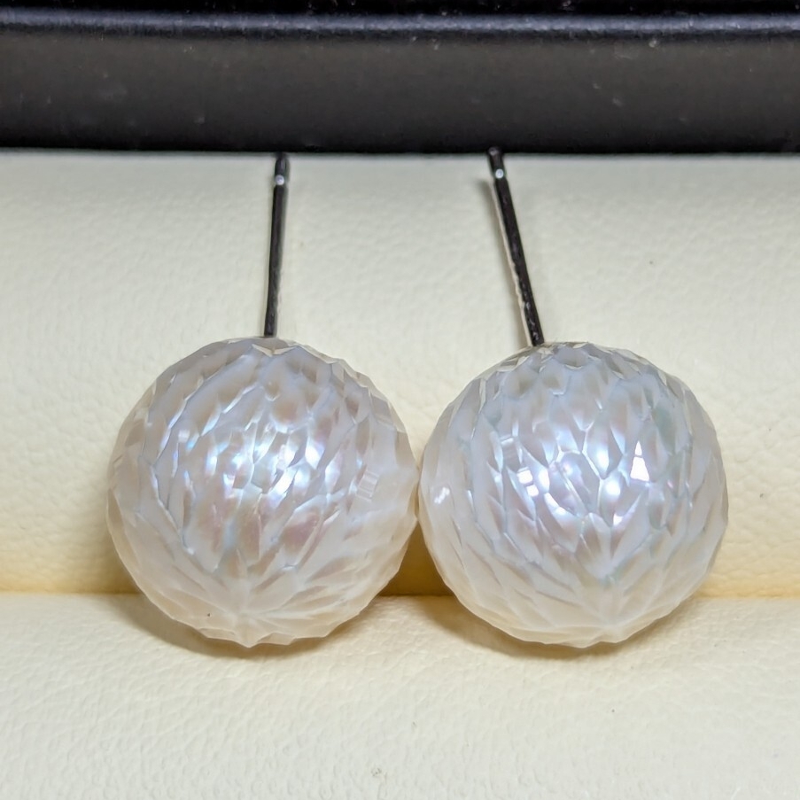 こちらは珍しいカットパールです。職人の手作業で、江戸切子みたいに、シャープなカットによって、立体感を生み出し、キラキラして綺麗です。