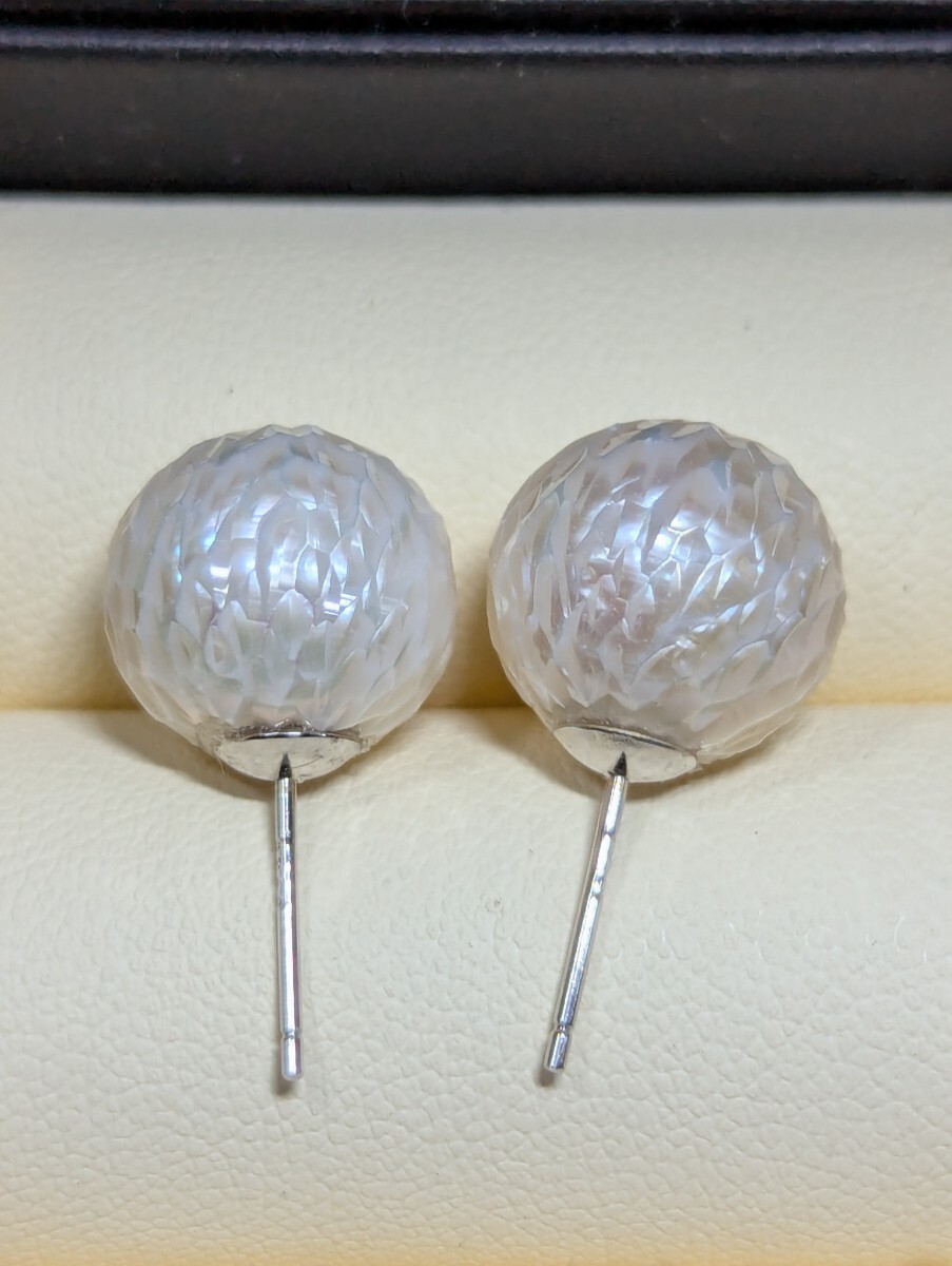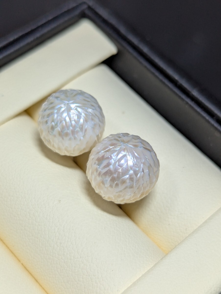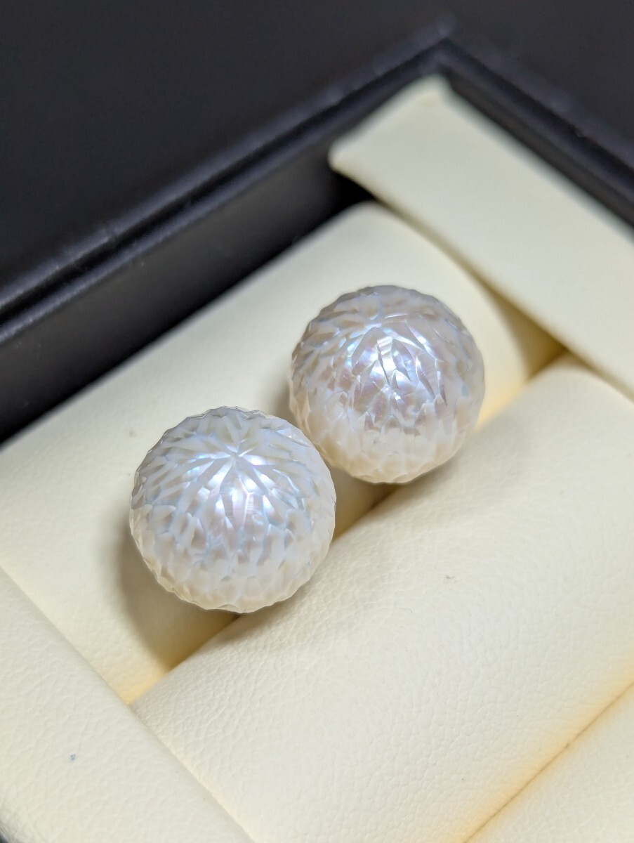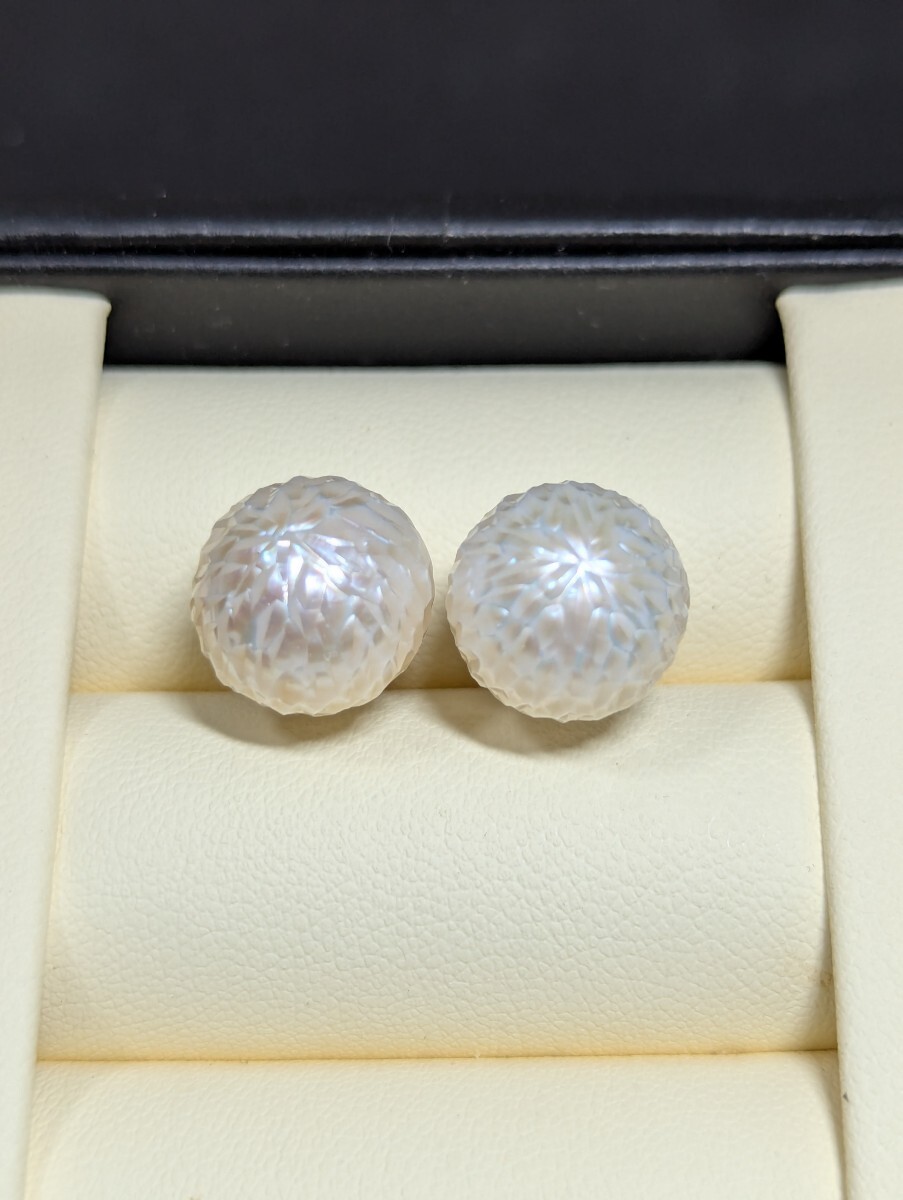 こちらは珍しいカットパールです。職人の手作業で、江戸切子みたいに、シャープなカットによって、立体感を生み出し、キラキラして綺麗です。