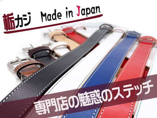 シンプル無地の栃木レザーベルトに、カラフルなステッチ入り。