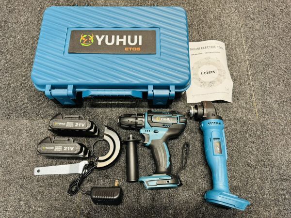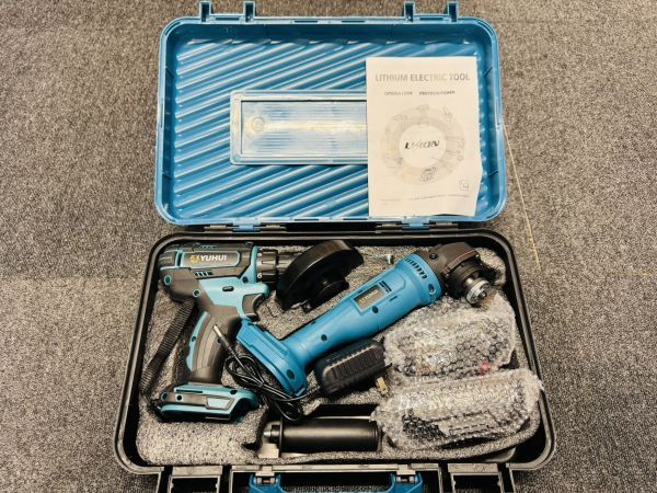 商品内容 ディスクグラインダー本体×1、ドリルドライバー本体×1、21Vバッテリー×2、充電器×1、グラインダー用カバー×1、グラインダー用ハンドル×1、グラインダー用レンチ×1、収納ケース×1