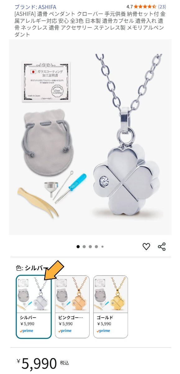ASHIFA 遺骨ペンダント 納骨セット付 シルバー色です☆