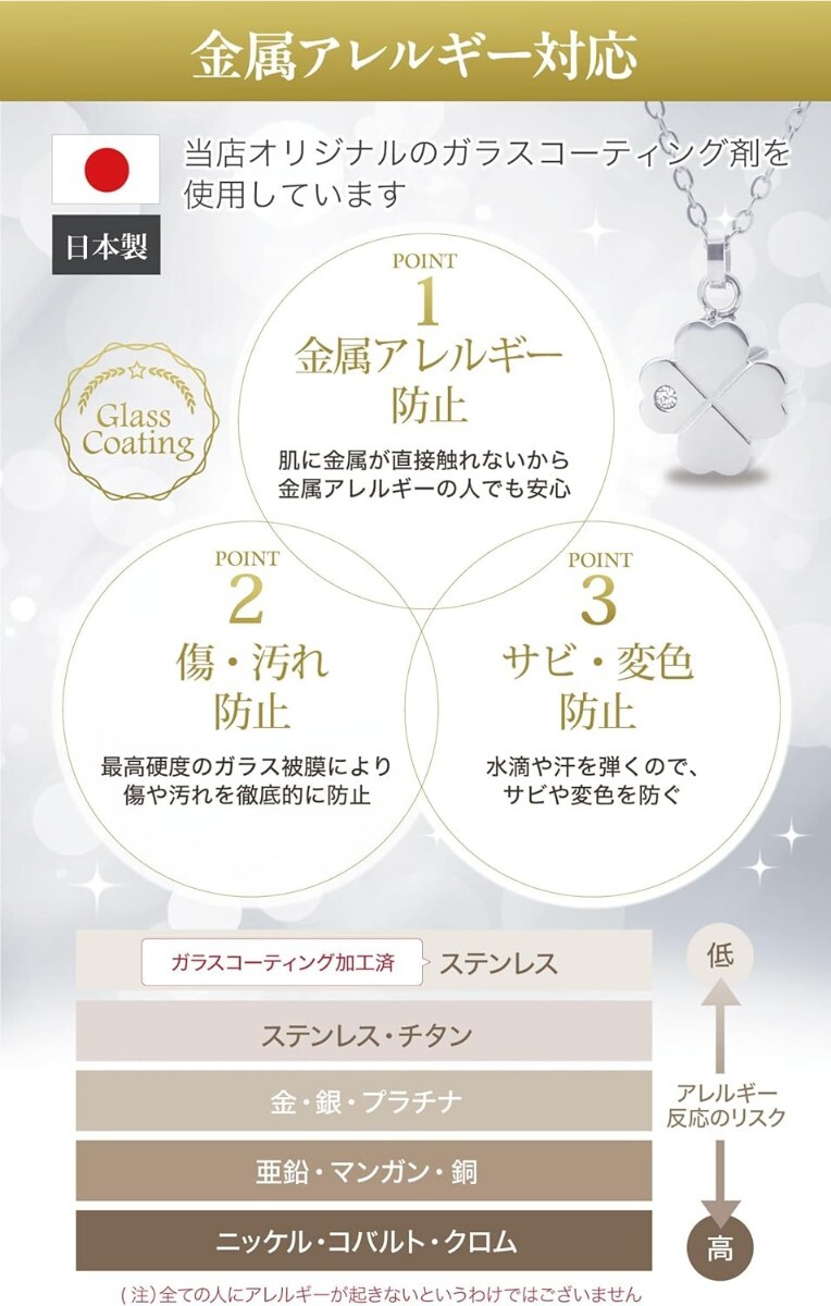 ●ペンダントトップ・ペンダントチェーン共に、サビや汚れに強く、アレルギーを起こしにくいと言われるステンレスを採用。