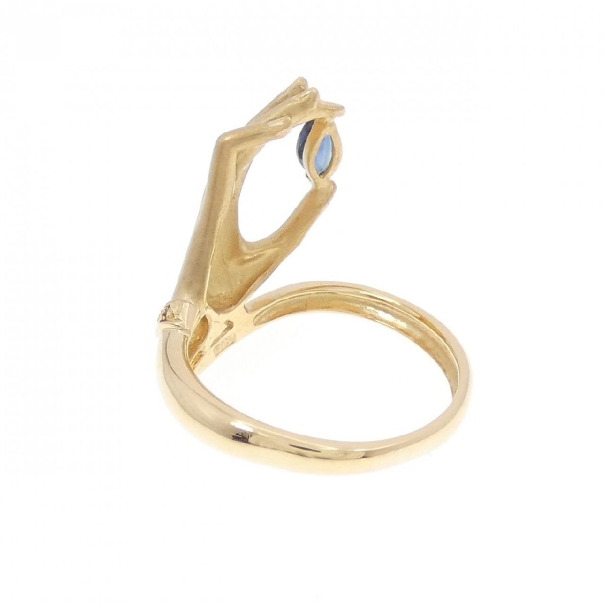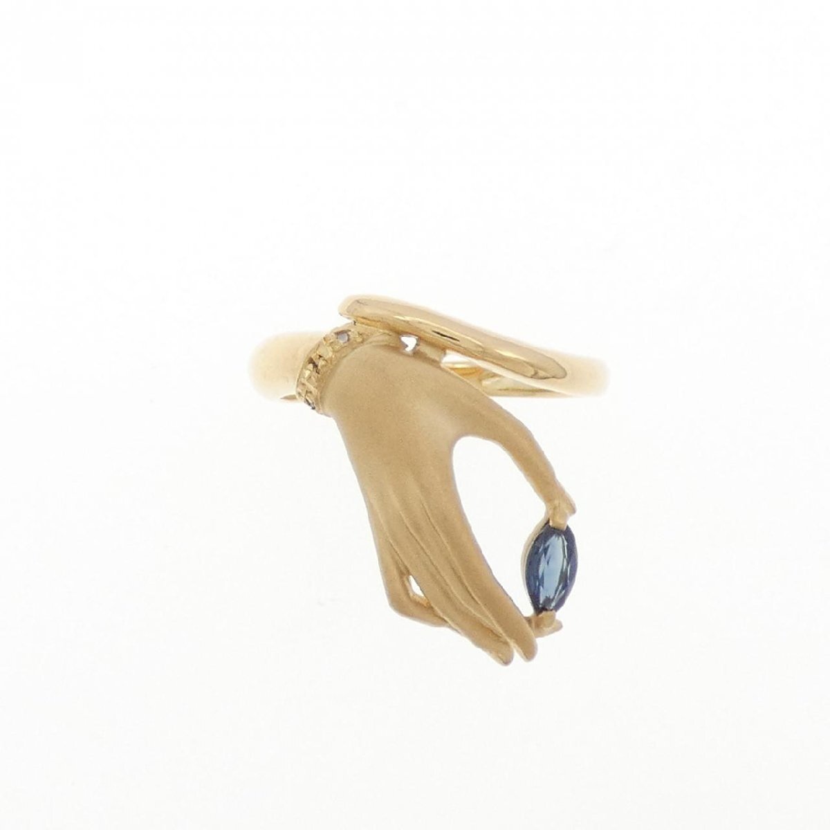 グレーがかったスモーキーブルーのサファイヤと照りのあるダイヤモンドがあしらわれた手のモチーフが印象的なリング。装いのポイントになってくれそうです。