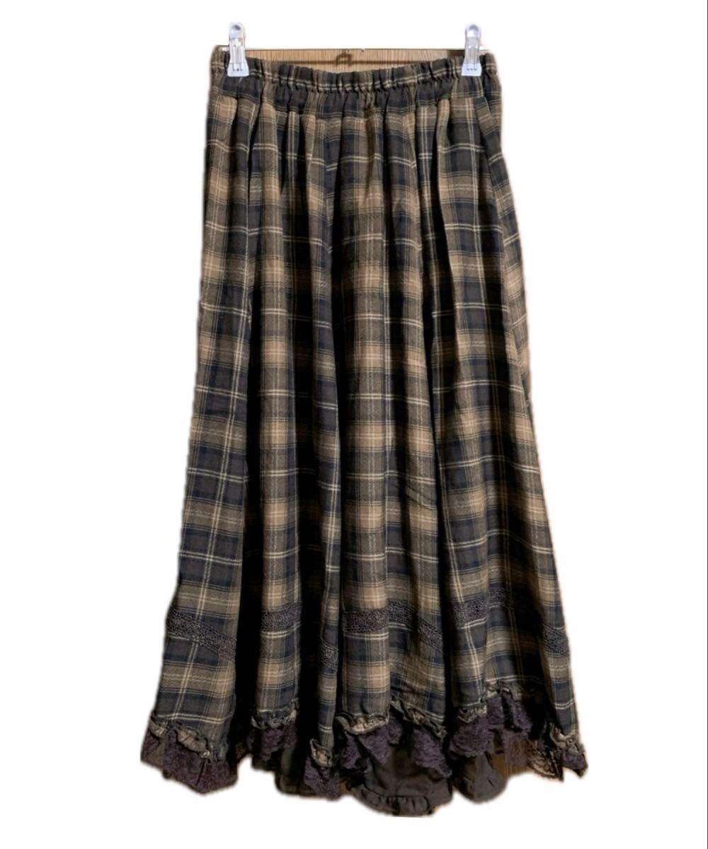 チェックのイレヘムスカートの下に、無地のロングスカートをレイヤードしたデザインのスカートです。ボリュームもあり、微起毛でほっこりしたアイテムです。