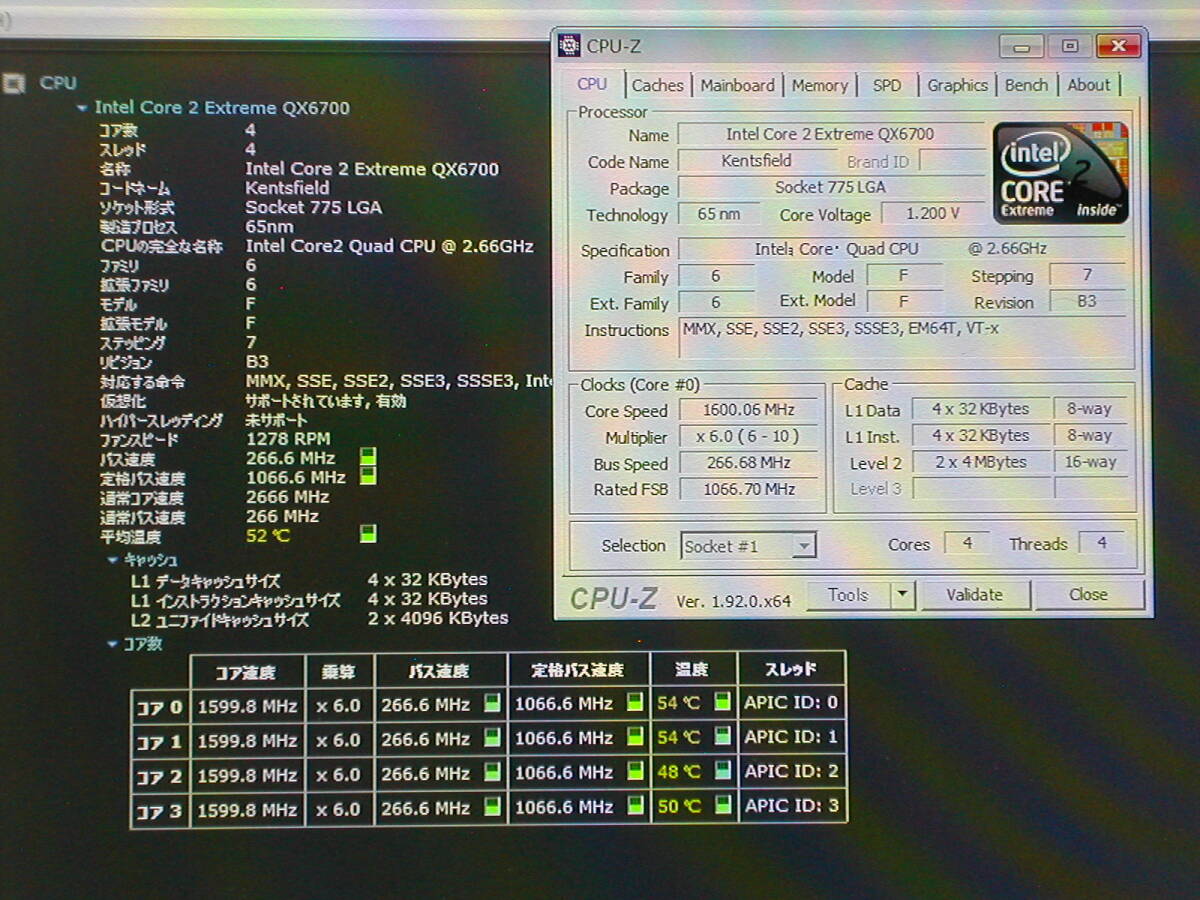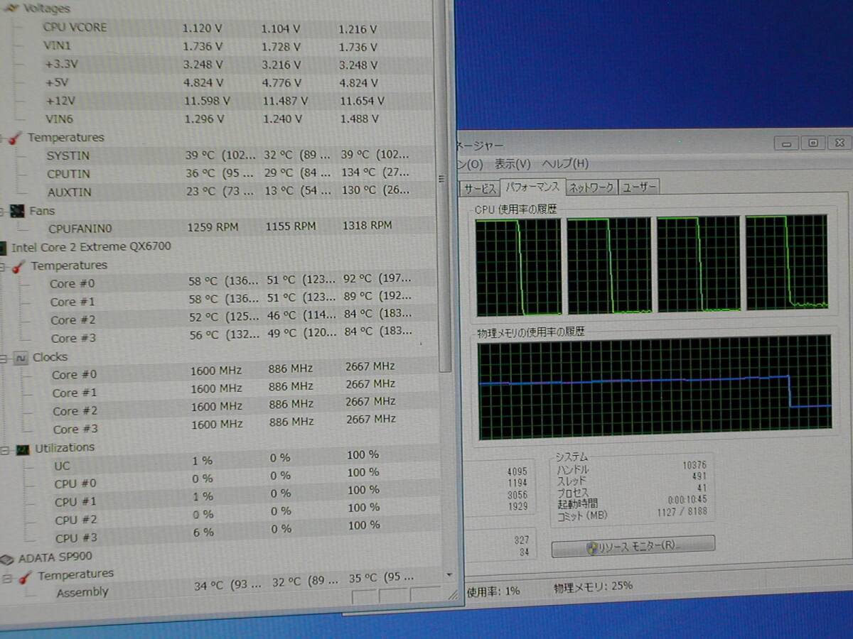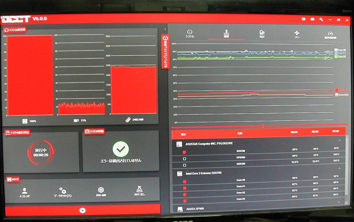 青バックのソフト画像は負荷ソフト終了直後の画像です、このくらいの負荷がかかった状態でも普通に動いていました。
