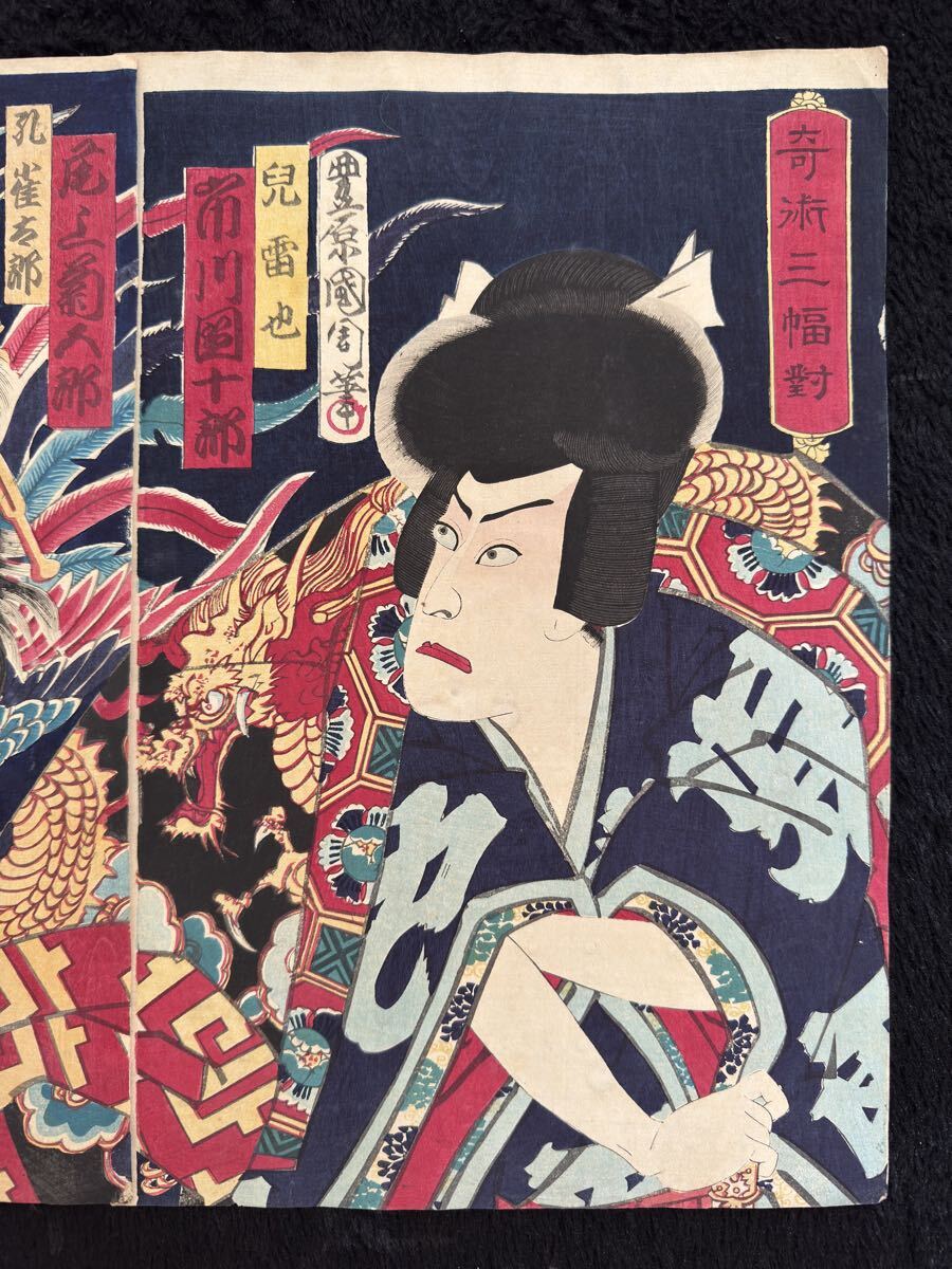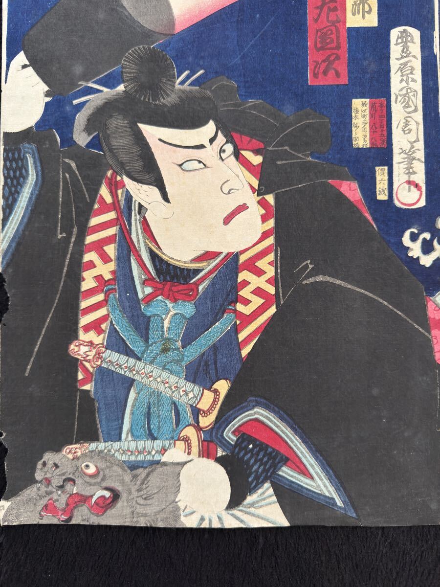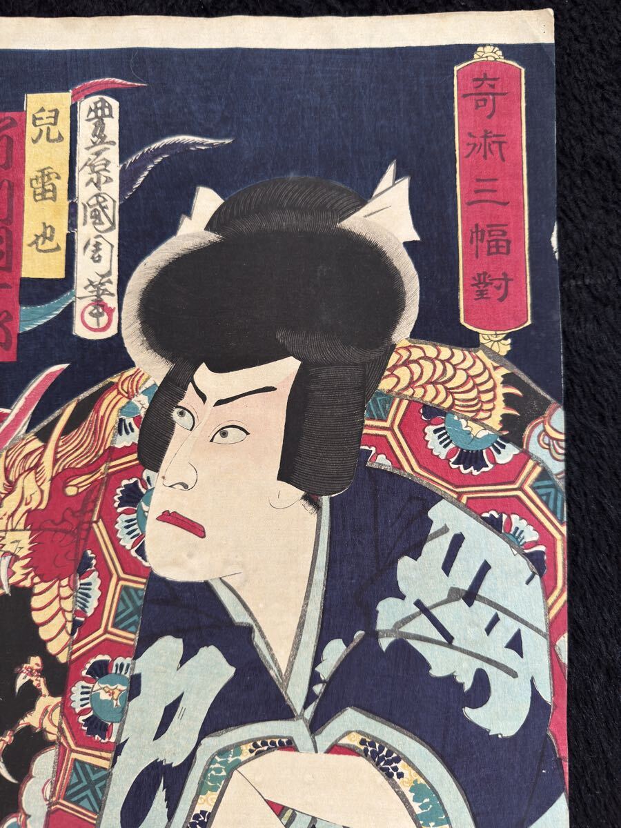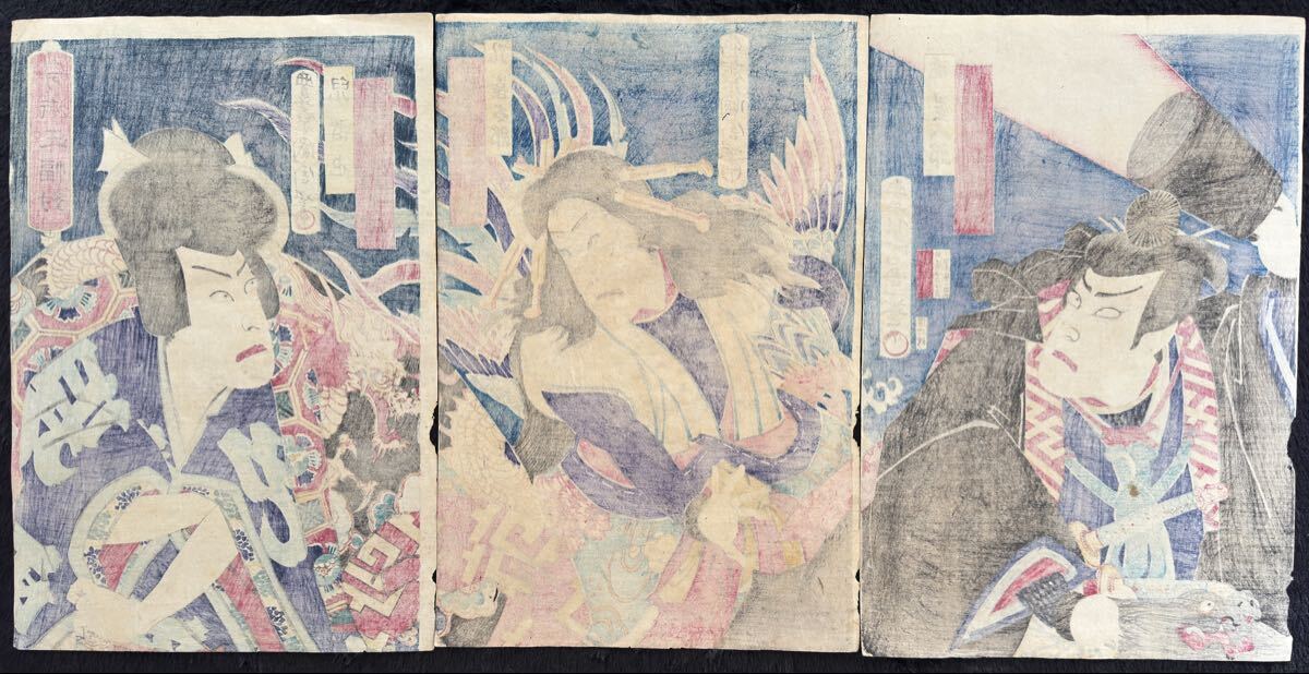 妖怪!明治期/真作 豊原国周「奇術三幅対 兒雷也」本物浮世絵木版画 歌舞伎絵 役者絵 芝居絵 錦絵 大判 三枚続き 裏打ち