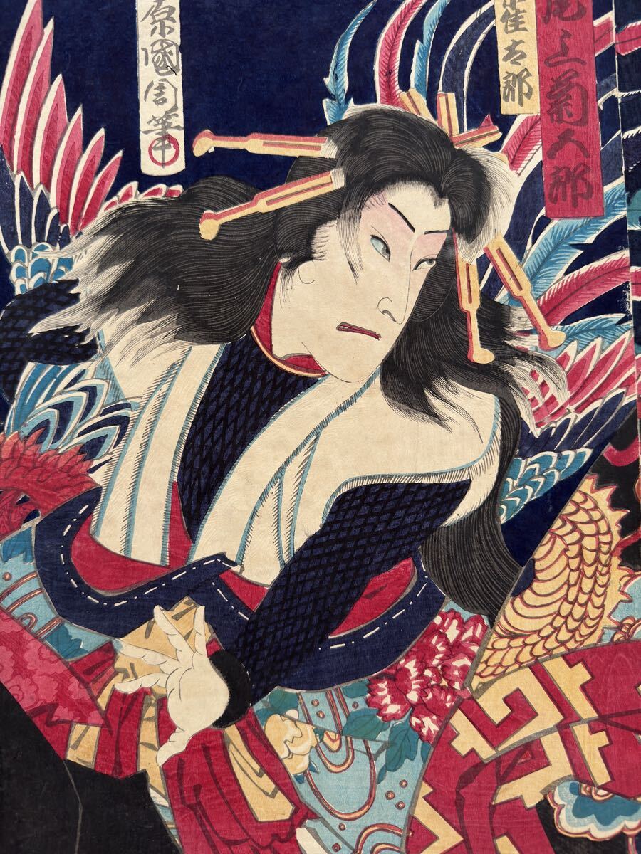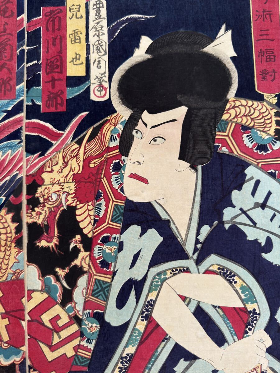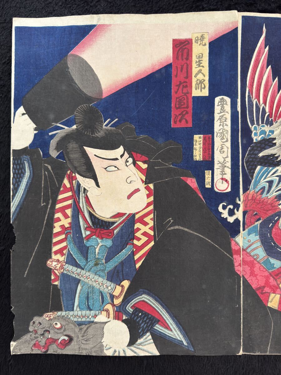 妖怪!明治期/真作 豊原国周「奇術三幅対 兒雷也」本物浮世絵木版画 歌舞伎絵 役者絵 芝居絵 錦絵 大判 三枚続き 裏打ち