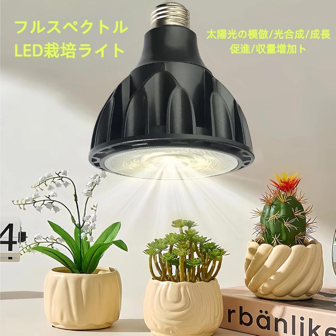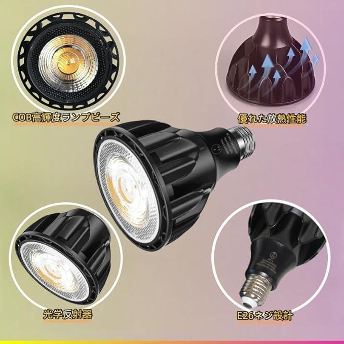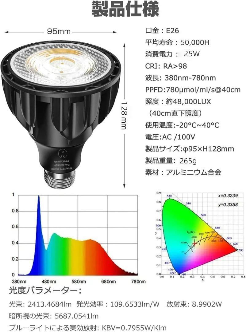 植物育成ライト (色温度 6000K、電力 25W、LED) フルスペクトル 集光レンズ(38°)付き広角レンズ(60°)付き E26口金 クールホワイトライト 高 PPFD