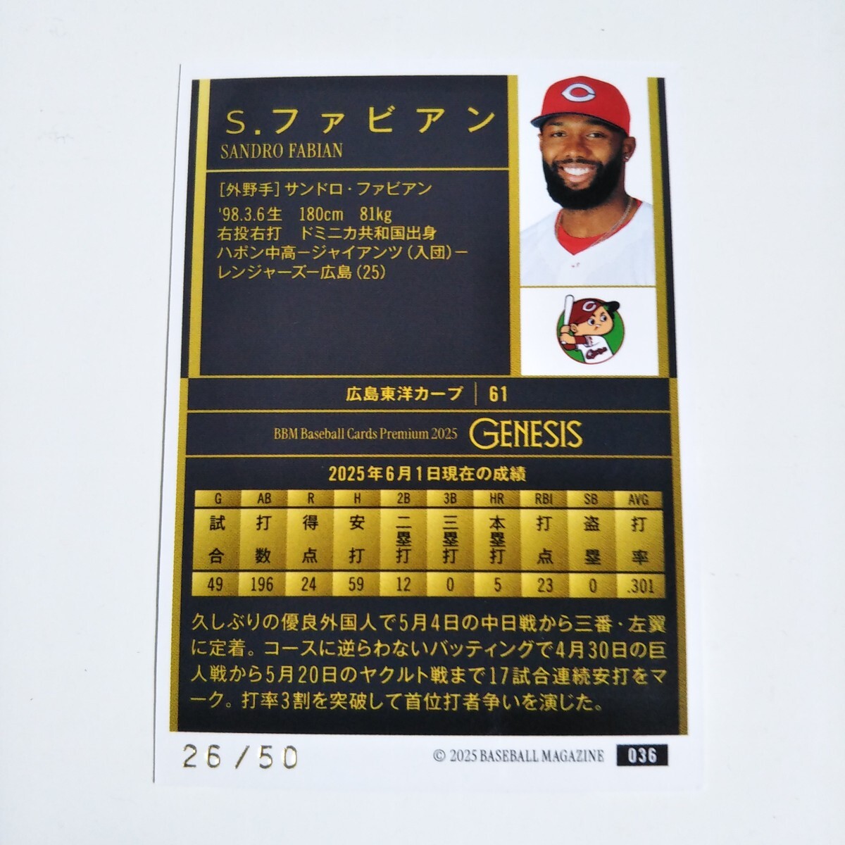 BBM2025 GENESIS 広島 ファビアン 50枚限定 オレンジ箔版 パラレル レギュラーカード No.036