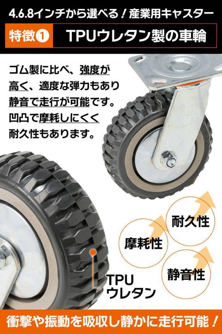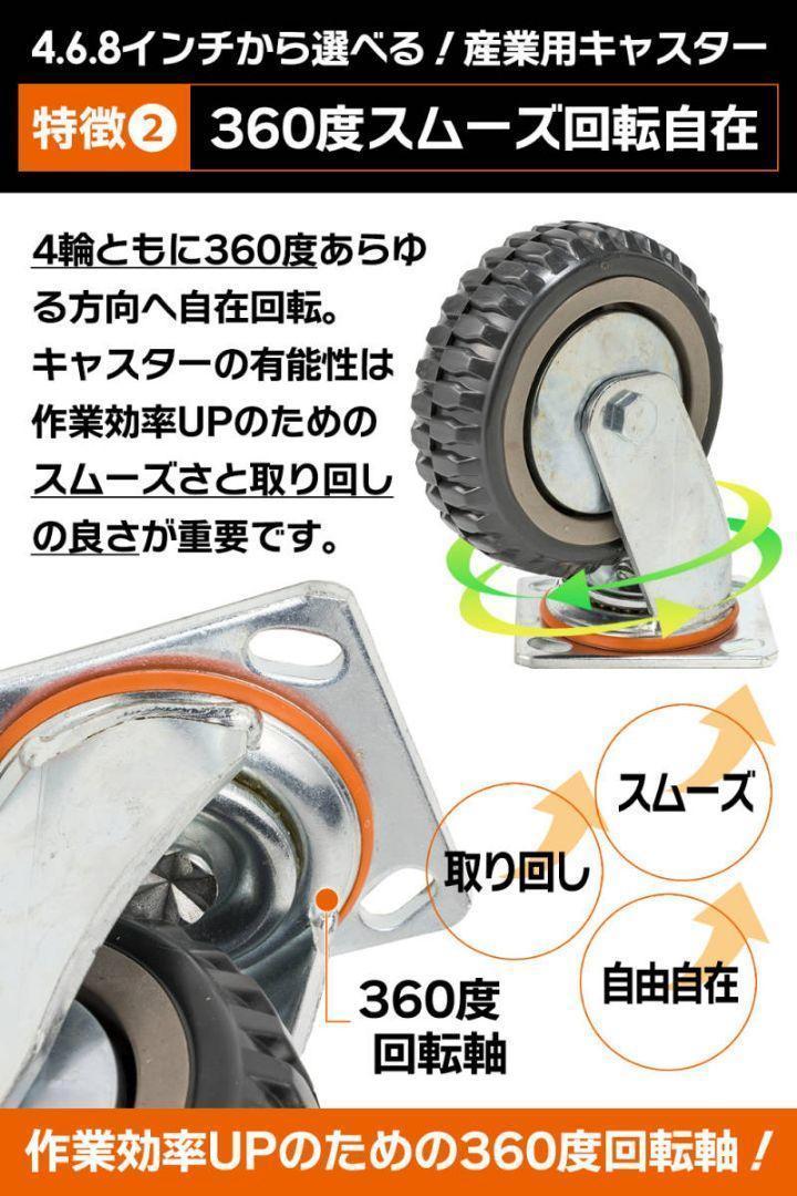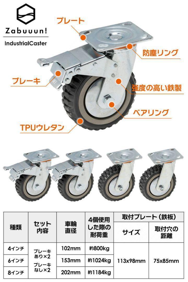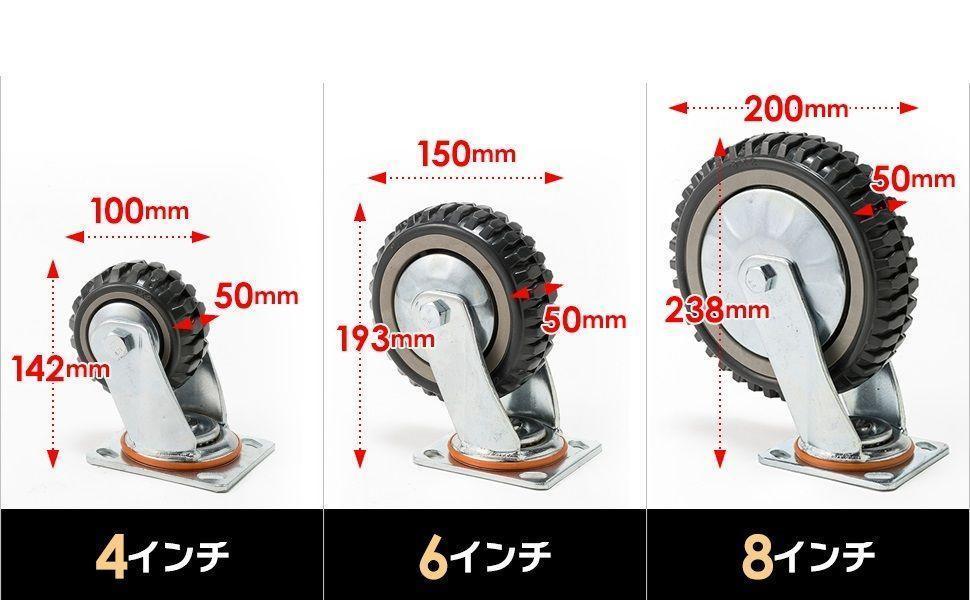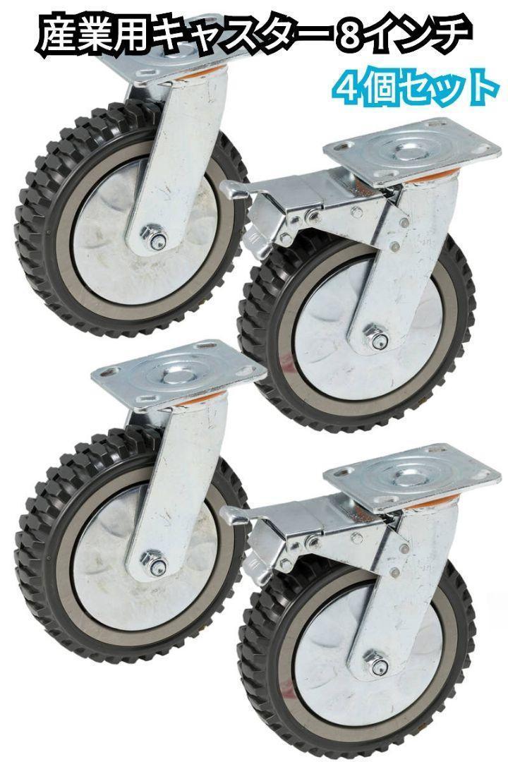 産業用キャスター 8インチ 直径Φ200mm 4個セット(ブレーキ有り×2個,ブレーキ無し×2個) 車輪 ホイール 耐荷重1184kg 静音 台車用