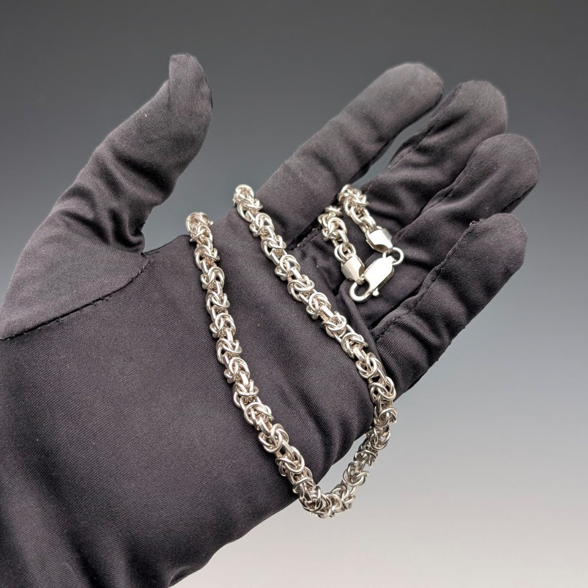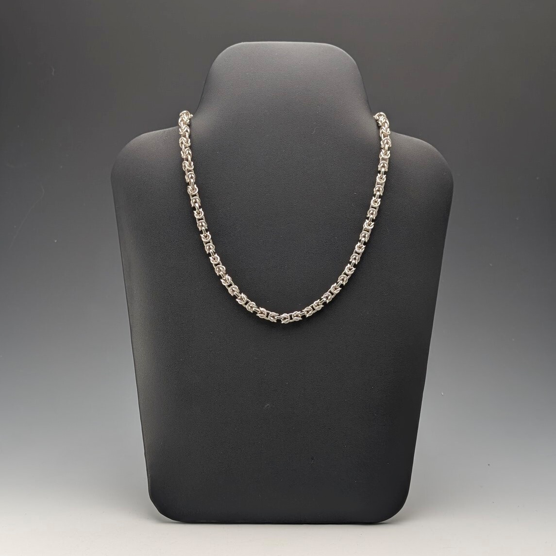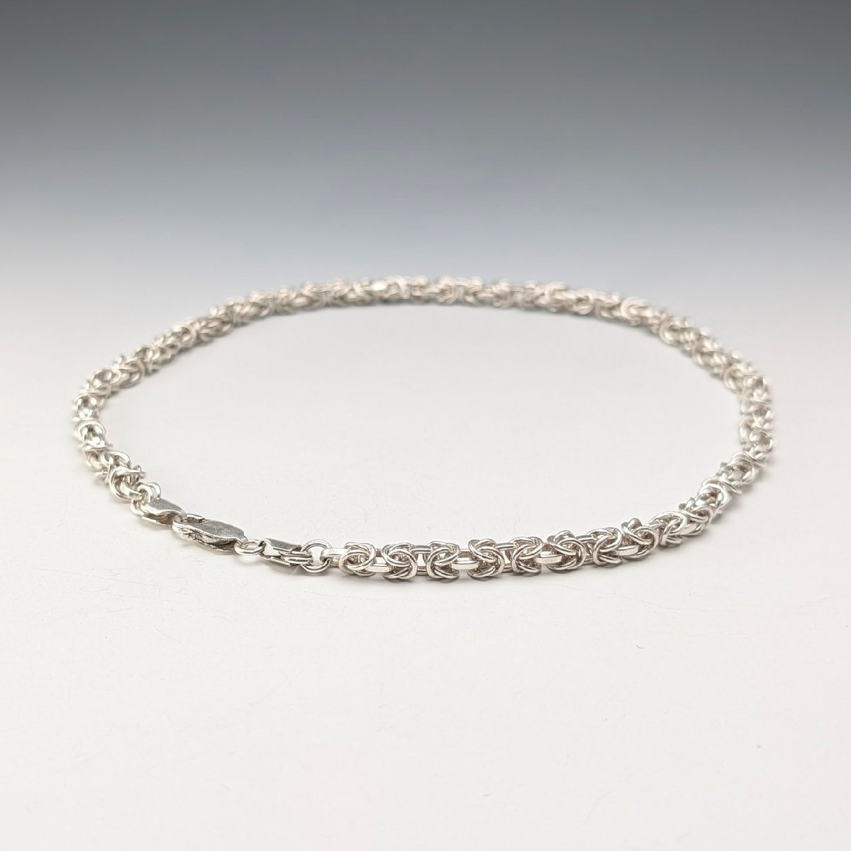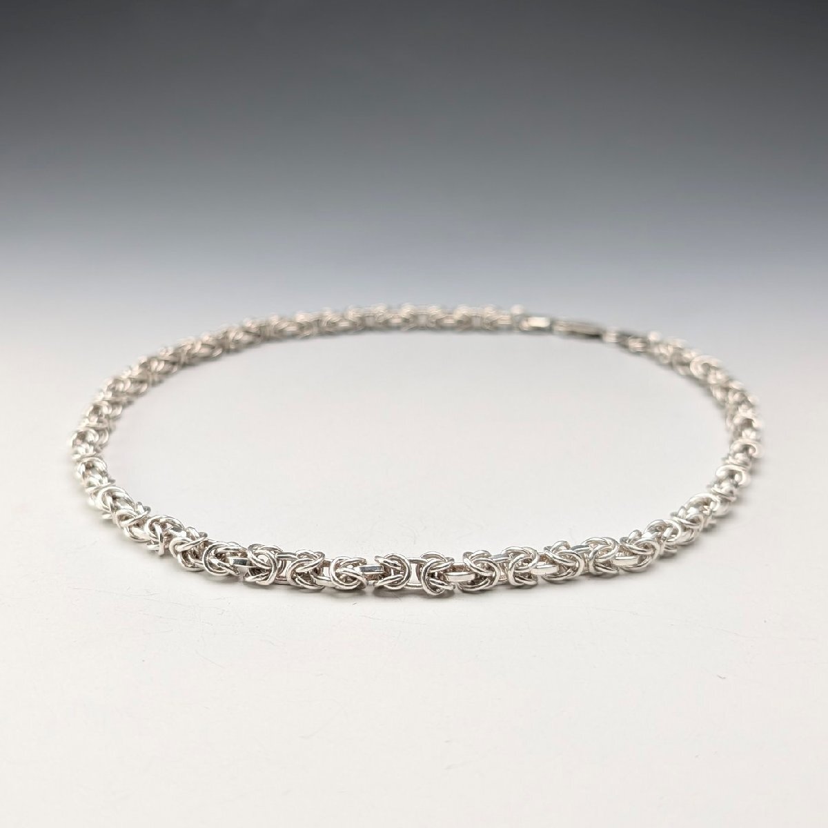 ビザンチンチェーンと呼ばれる丸カンを編んで作られた複雑な造りの純銀製チェーンのネックレスです。