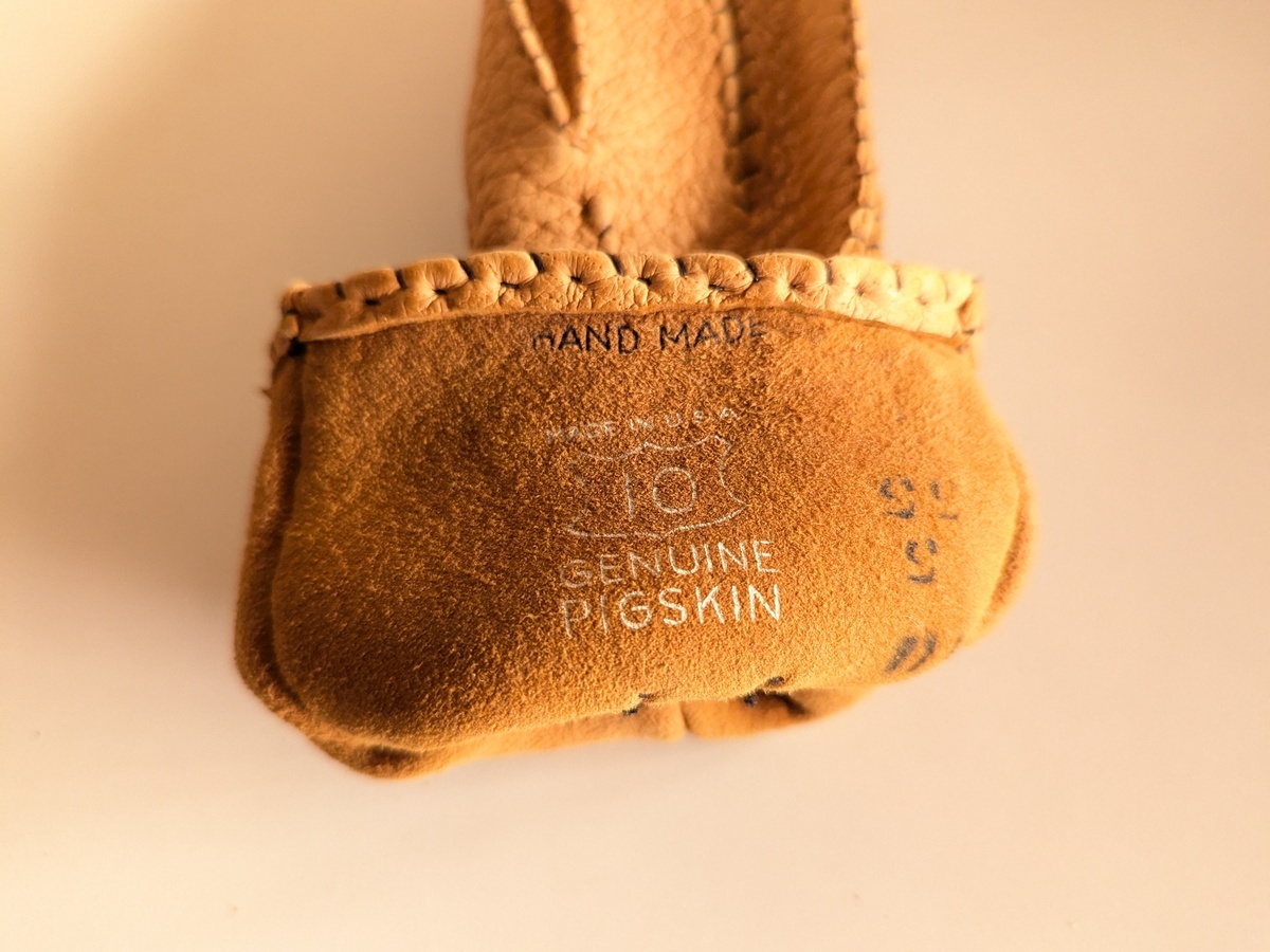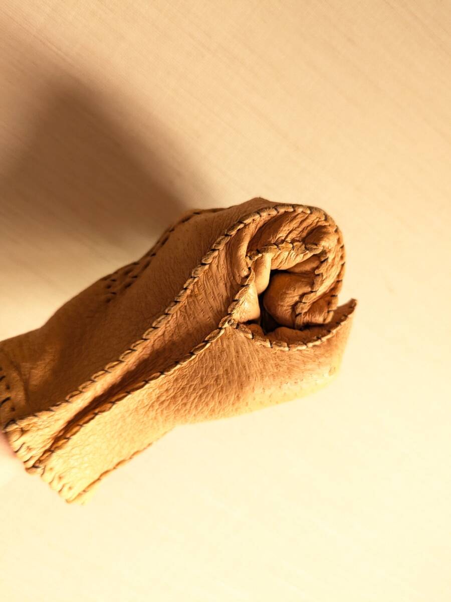 ヨーロッパでは見られない極厚のペッカリーです。普通ミシンですがこちらは手縫い仕立ての表記のある高級品で、かつてのアメリカらしい巻縫いがスポーティです。