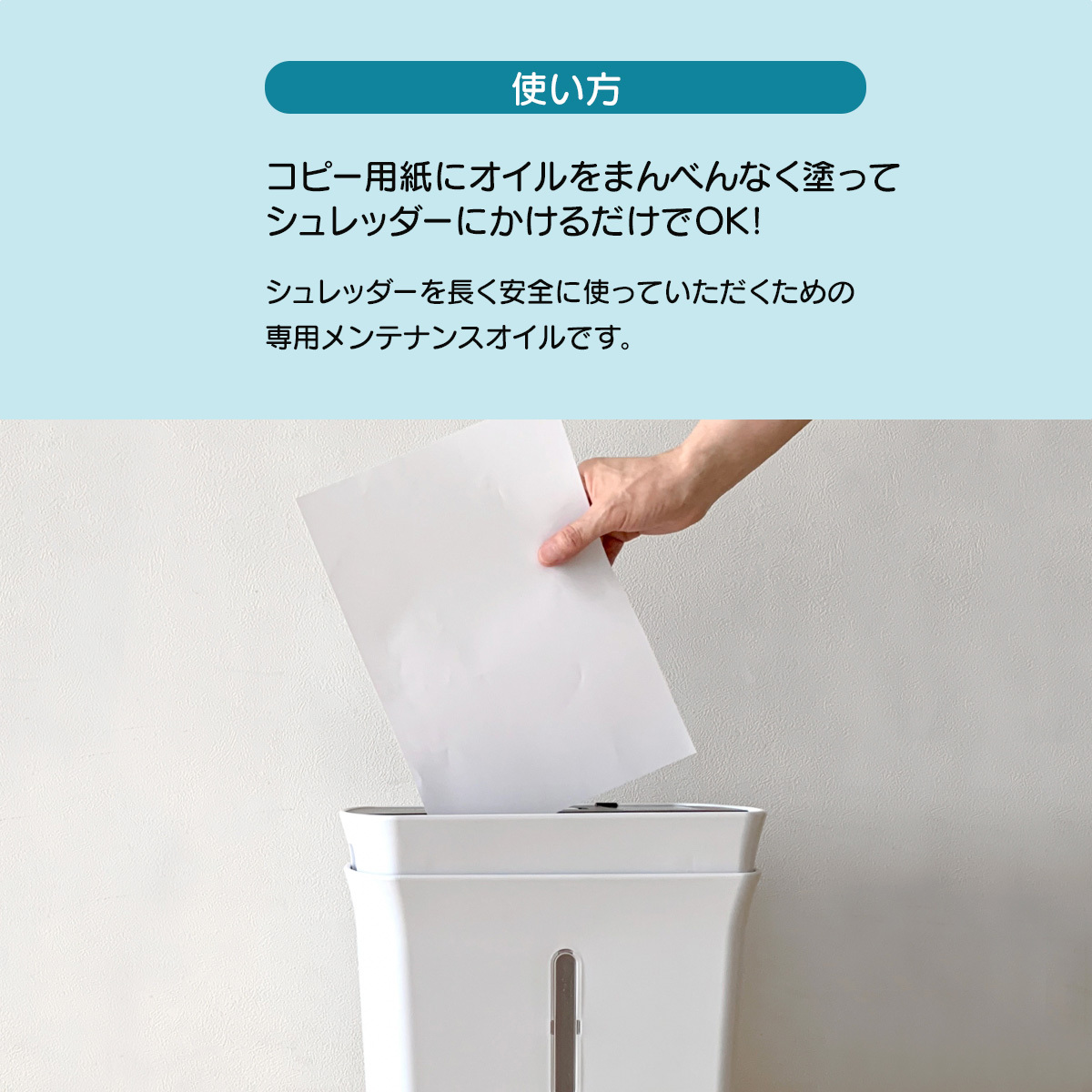 | 説明 | コピー用紙にまんべんなくオイルを塗って、シュレッダーにかけるだけのメンテナンスオイルです。半年に一度のご使用で約5年間分です。直接塗りやすいトンガリ型のツイストキャップです。製造:日本 |