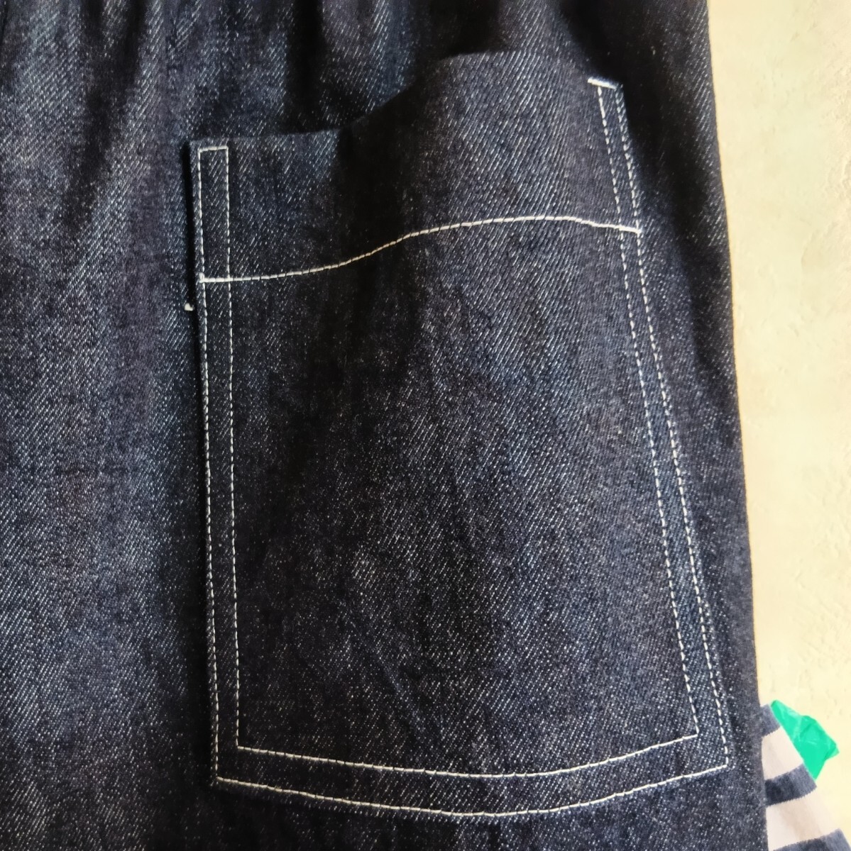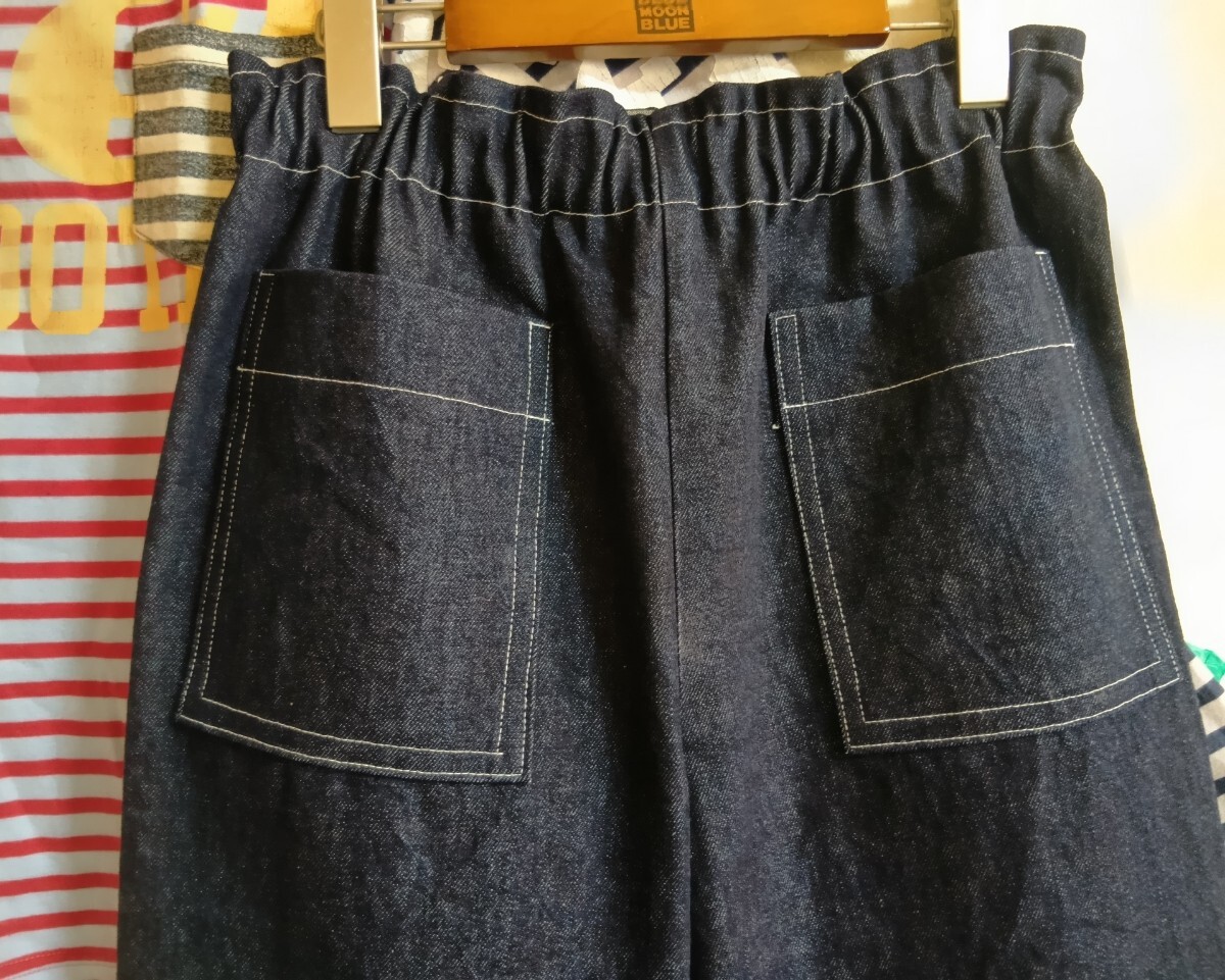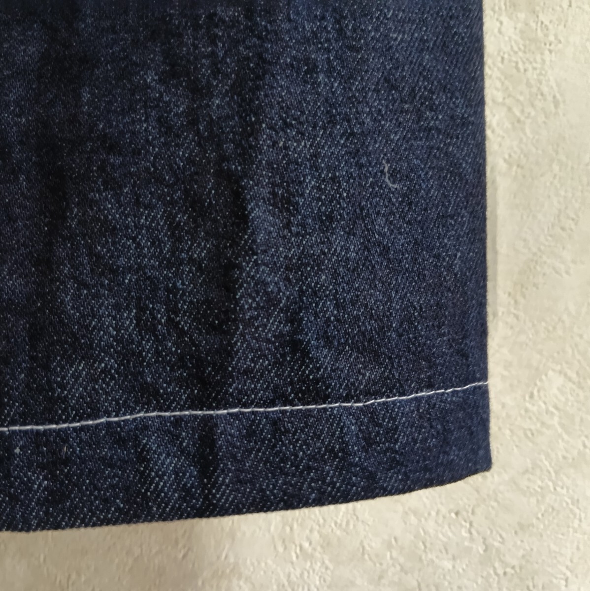 ジーンズ並のしっかりしたインディゴデニムで仕立てました。ステッチ糸は白を使っています。