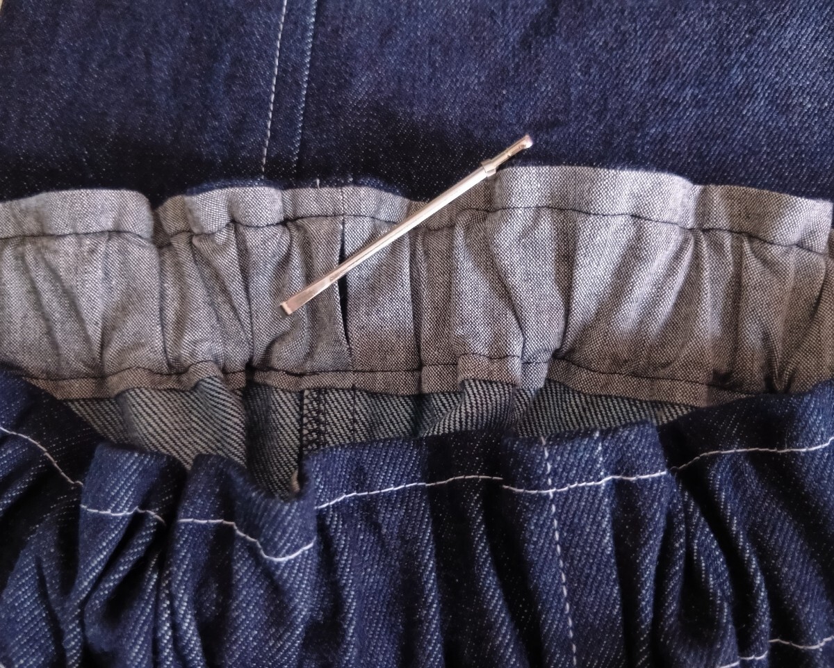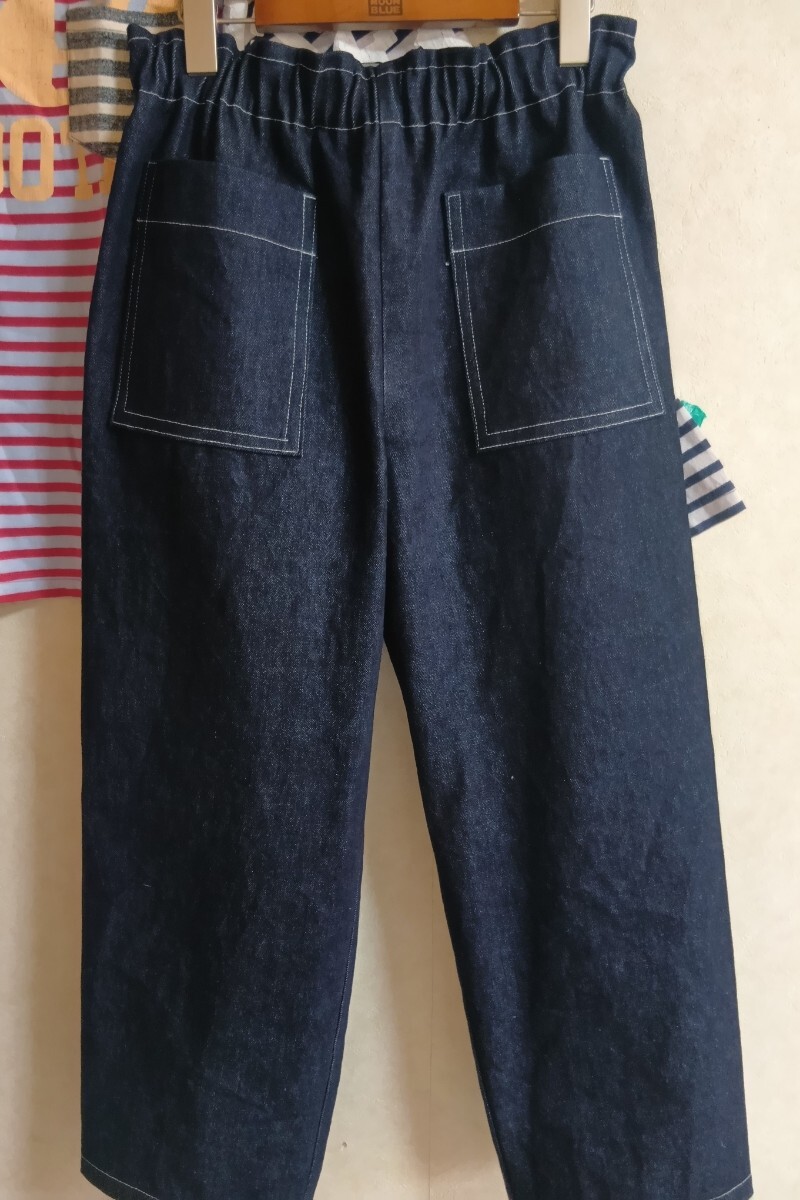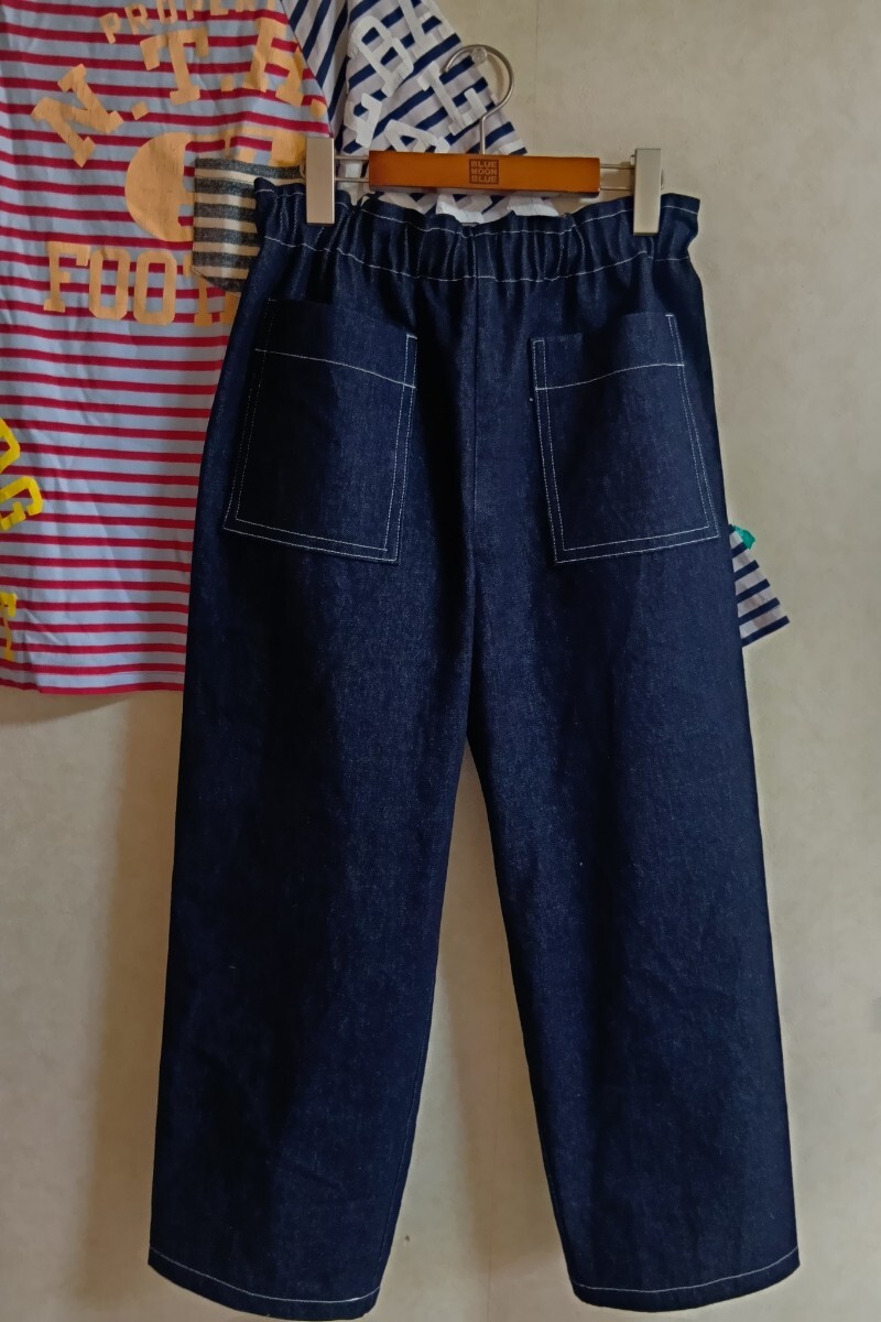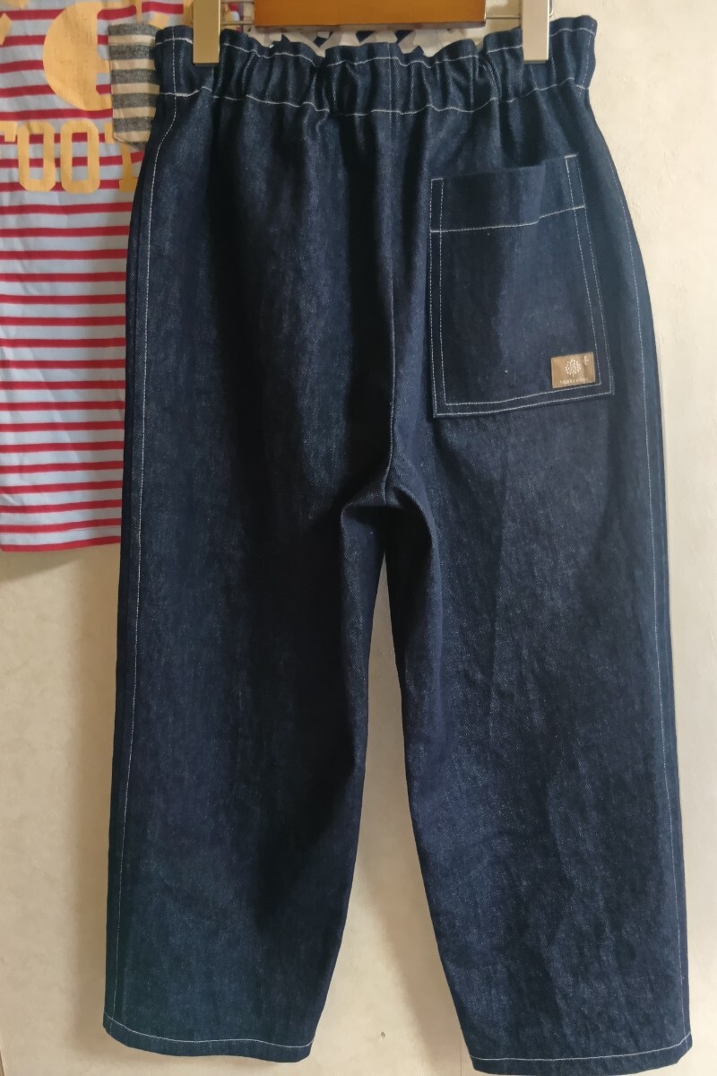 ジーンズ並のしっかりしたインディゴデニムで仕立てました。ステッチ糸は白を使っています。