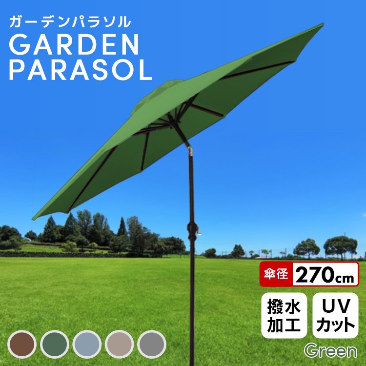 バーベキューにピクニックにビアガーデンと晴れた日には欠かせないアイテム! 日差しの向きにあわせて傘の角度調整ができる便利なガーデンパラソルです。 パラソルの開閉には、普通の傘とは違いハンドル式を採用。 ハンドルをクルクルと回すだけで開閉できるので、これほど大きなパラソルでも女性一人で簡単に開閉できます。 UVカットが施された270cmという大きなパラソルが強い日差しから守ってくれるので、 直射日光を気にせず快適にガーデンライフを楽しんでいただけます! アルミ製支柱なので木製パラソルと比較して軽量! ご自宅のお庭、バルコニー、テラスや店舗先のカフェペースなどにお使いいただけます。 河原でのバーベキュー、夏場にお子様のプール遊びの時にご使用になっているお客様もいらっしゃいますよ 【商品仕様】 ・カラー:グリーン ・サイズ:(約)φ270cm×H240cm ※ポールの直径:(約)3.8cm ・収納時サイズ:(約)140cm×25cm ・重量:(約)4.6kg ・素材:ポリエステル、スチール、アルミ他 ※パラソルベースは別途ご用意ください※ 【注意事項】 ・傘生地には撥水加工をしておりますが、完全防水ではありません。 ・風や雨が強い日の使用は危険ですので、ご使用しないでください。 パラソルやベースを地面に固定しても突風や瞬間的な豪雨などでパラソルが破損する場合がございます。 そのような自然現象による破損につきましては保証の対象外となりますのでご注意ください。 ・商品は、モニターによって色合いが異なって見える場合があります。 ・仕様・デザインは改良のため予告なく変更することがあります。 |