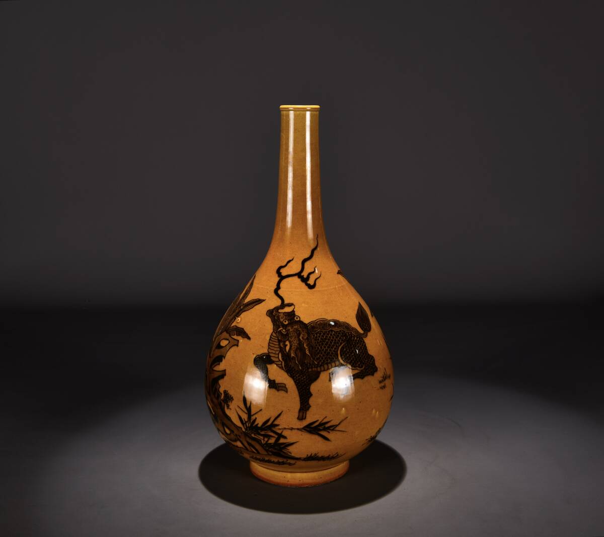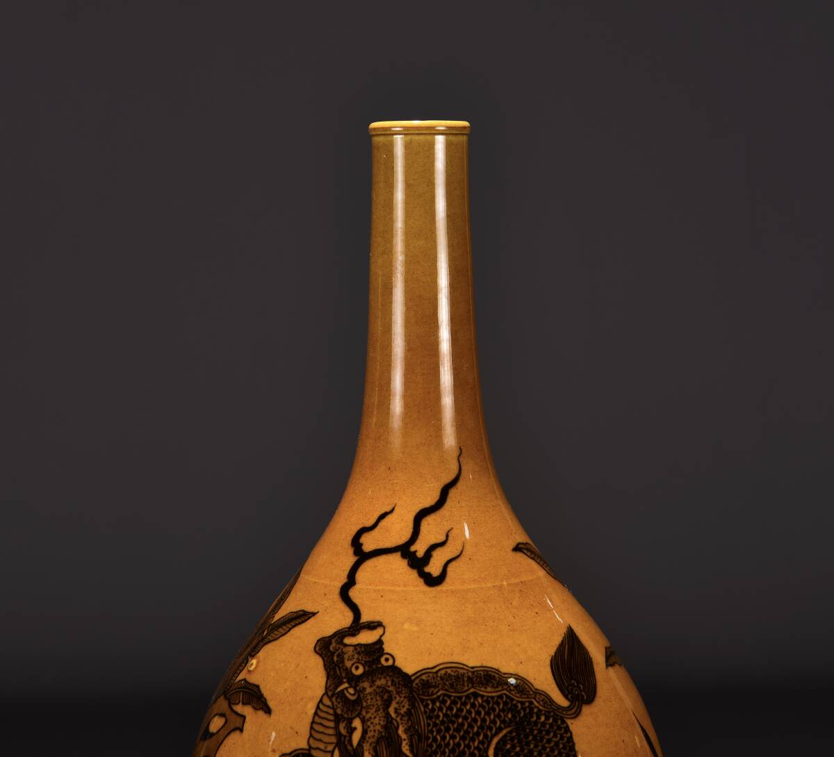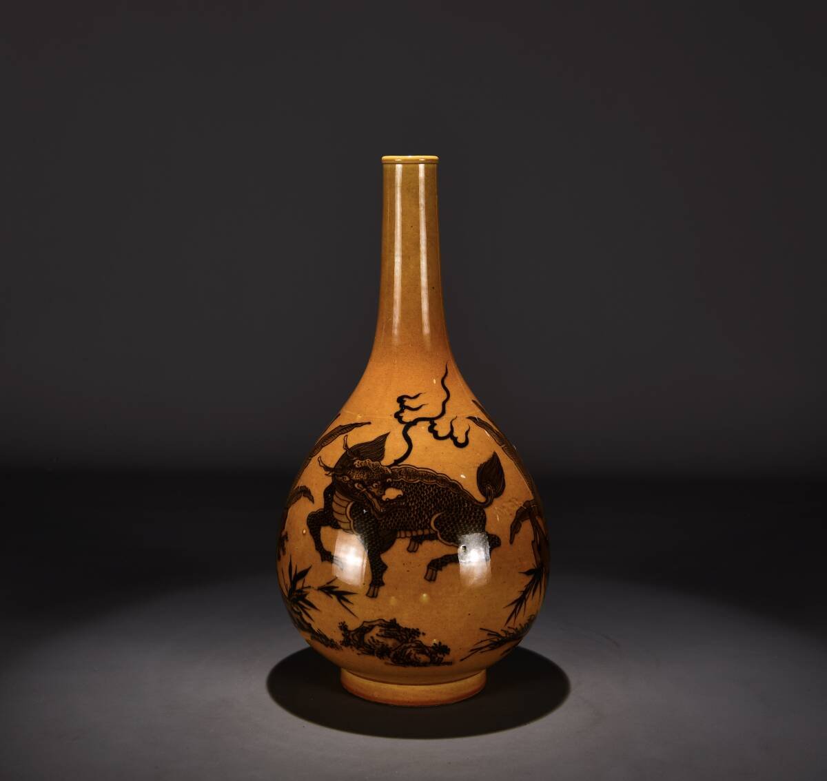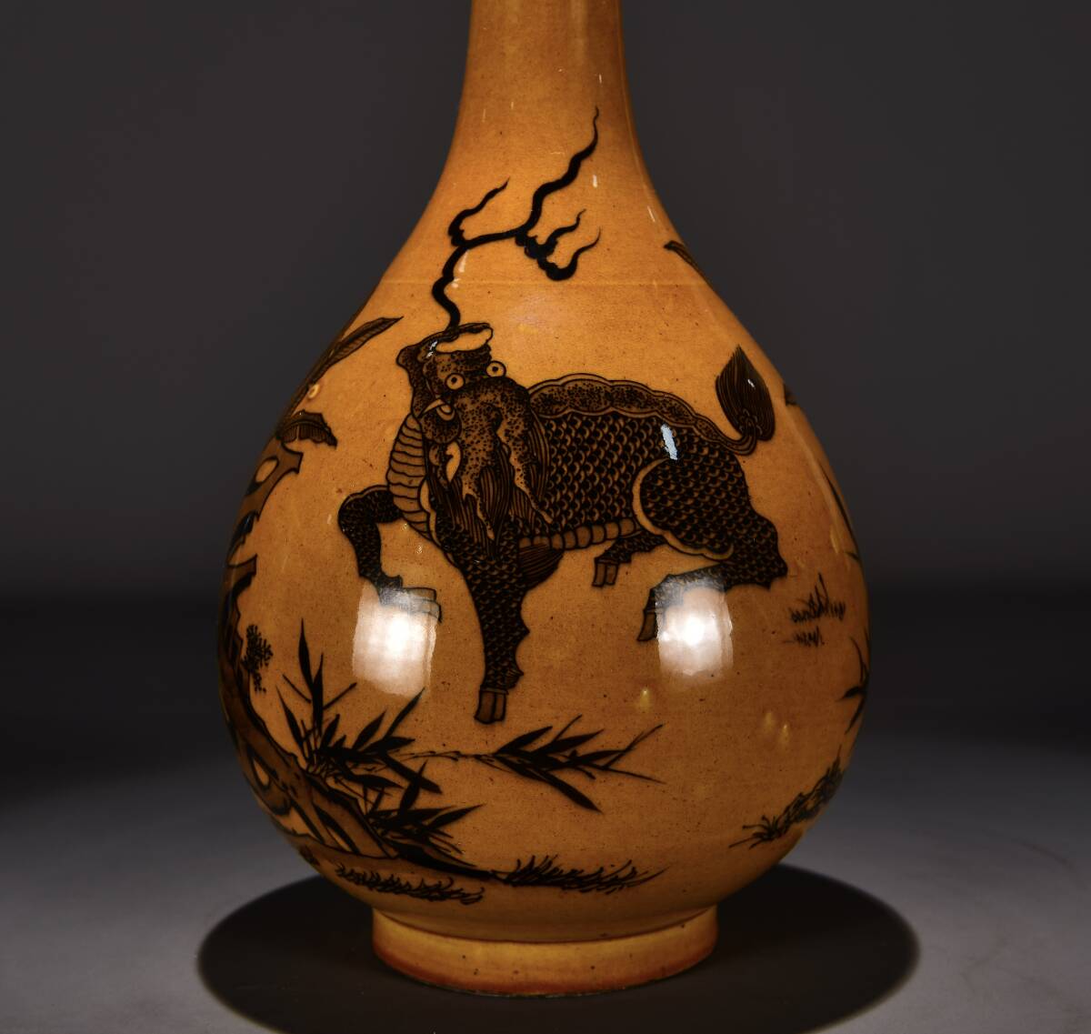 【超珍館蔵】清 康熙年制款 古陶瓷品 青花 黄釉 麒麟紋 膽瓶 陶藝 古賞物 古董品 古美術品 時代物 旧家蔵出 稀少珍蔵品