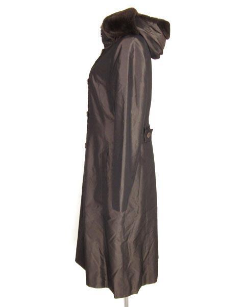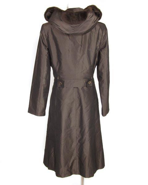 | お上品で繊細なハリ艶が美しいシルク仕立てのコート。フード部分にヌートリアファーをあしらった逸品。お召しいただきやすいジップアップデザイン。フロントのロゴボタンもさり気ないアピールになりますよ♪アームホール繋ぎ目部分の縫いつけがやや甘くなっています |