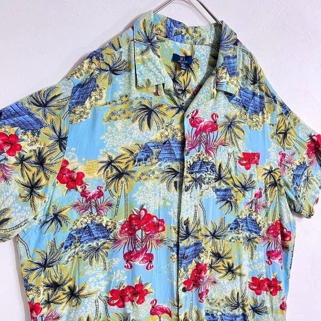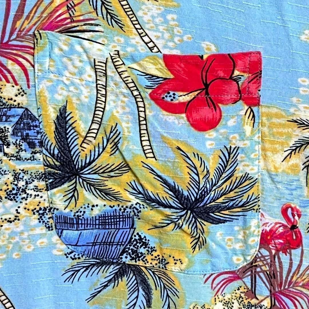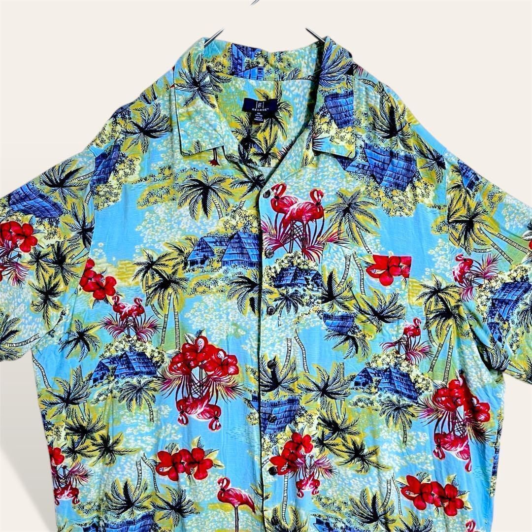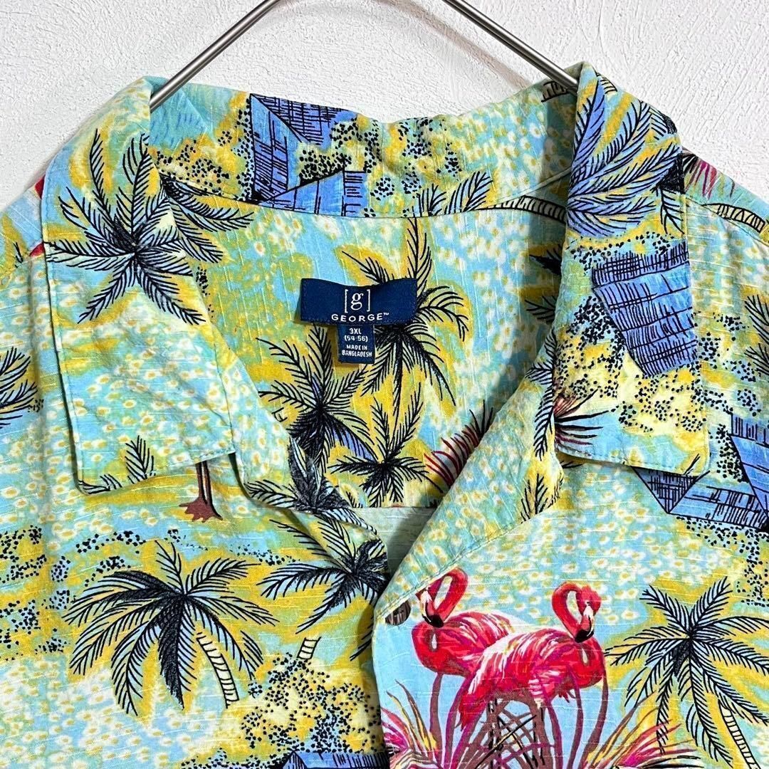 ★商品名★バングラデシュ製 ハイビスカス フラミンゴ ヤシの木柄 小花模様 半袖 アロハシャツ メンズ