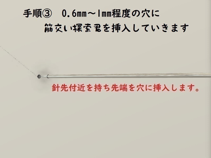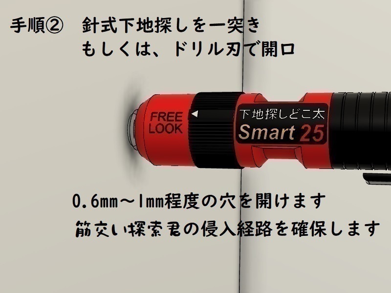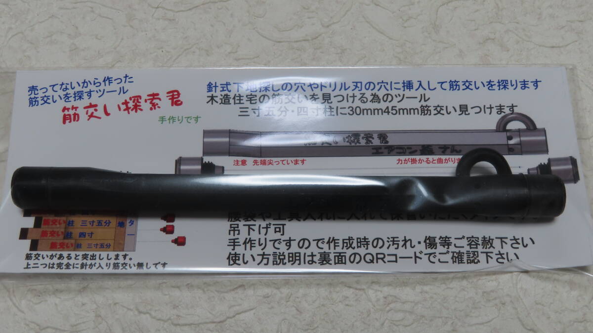 商品説明 | 奥にある筋交いを探るためのツール。 エアコン屋さんが、売ってないので手作りしました。 「筋交い探索君」 「筋交い探索君」 2本組 1つの収納ケースに、筋交い探索君を2本収納しています。 使い方 針式下地探しの穴に挿入して使用します。 針は0.6mm径です。 下地がある場合は、1mm鉄工用ドリルで下地を貫通後、挿入して確認します。 筋交いがある場合、突出してその存在を知らせます。 突出せず、針の部分が完全に入り込む場合は筋交いはありません。 針式下地探しと同様の感覚です。 木造軸組みに対応しています。 土壁には対応できません。 簡易リフォームの住宅には対応できない場合があります。 使い方の説明を動画にまとめています。 よろしければご覧ください。 https://youtu.be/Mk0iVcdnAMw 又、筋交い探索君を使ってエアコン穴を開けている動画もございます。 当初開口予定位置で筋交いを発見、回避の後開口の作業動画です、併せてご覧ください https://youtu.be/6ecmlAYq-Yw コピーアンドペーストでお願いします。 |