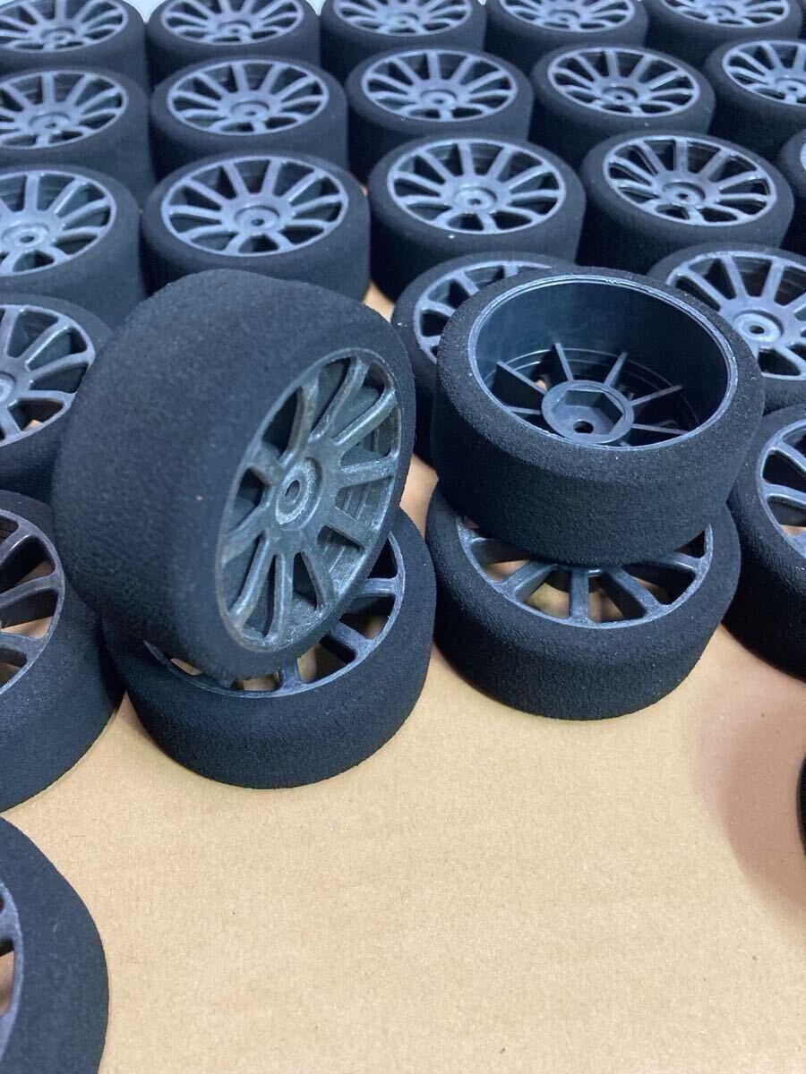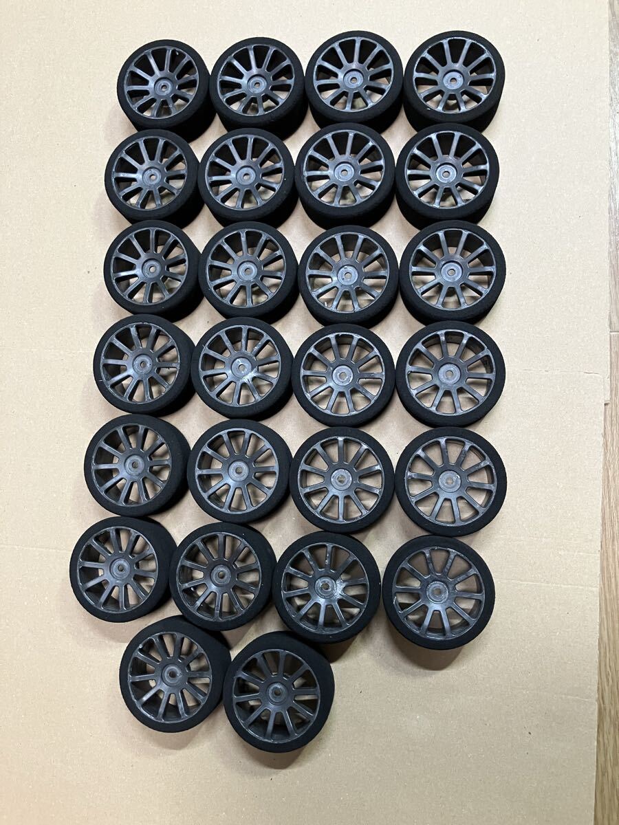 1/8用フロントタイヤ32°を剥がして1/10用ホイールに接着して整形した物です。外径は61mmに揃えてありますが硬度のバラつきはあります。ホイールにキズ、汚れがあります。13セット(26個)。