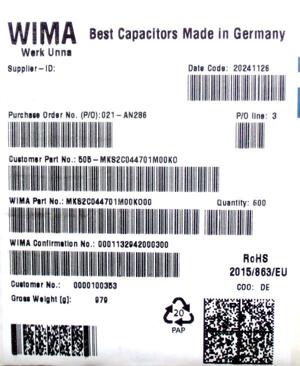 オーディオ回路でよく使用されるWIMAのフィルムコンデンサ 63V 4.7uF ±10%品です。赤のパッケージが目に眩しいですね。 こちらの MKS2は、メタライズド・ポリエステル・フィルムコンデンサに分類されます。 4.7uFのフィルムコンデンサとしては破格の小ささで、積層セラミックコンデンサ並みのリードピッチを実現しています(5mm)。※ストレートリードのテープリール品です。 フィルムコンデンサとしては大容量の4.7uF品のため、アンプの入力部や、DAC出力部のカップリングコンデンサにお勧めです。 オーディオ系のローパスフィルタとしても優秀で、共立などのキットの上位部品としてよく使用されていました。勿論、電源ラインに電解コンデンサと並列に差し込むと、積セラを入れるよりも圧倒的に周波数特性が向上します。 オーディオのアナログ系電源には、積セラは使ってはいけない、と言う人までいるので、これを機会に、積セラレスのオーディオ回路を構築してみてはいかがでしょうか? 現在出品中のWIMA製フィルムコンデンサ ↑↑↑商品へのリンク 是非注文をご検討ください。 ■只今の在庫:18セット ★ 4個セット・10個セットでそれぞれ出品しています。 ★ 他に出品中の電子部品系も同梱可です。 |