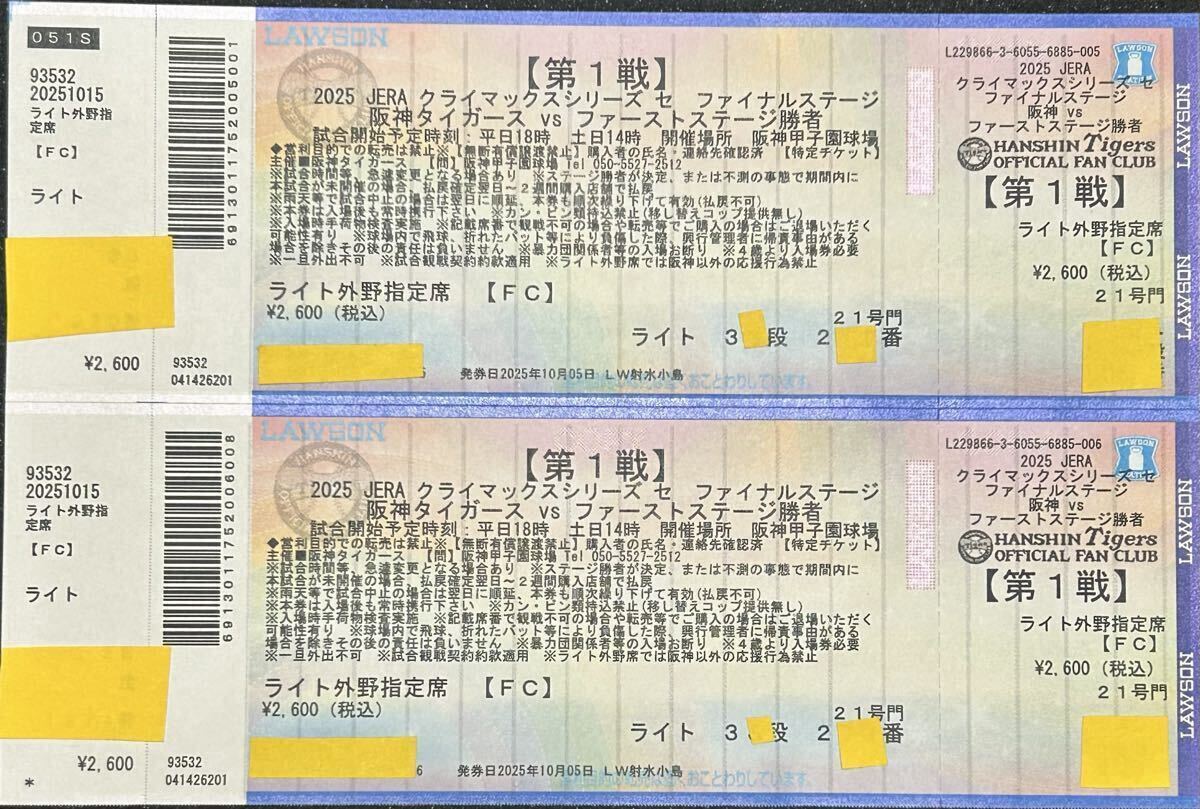 【第1戦】10/15(水)クライマックスシリーズファイナル 阪神タイガース ライト外野指定席 30〜35段200番台 ペアチケットです。①