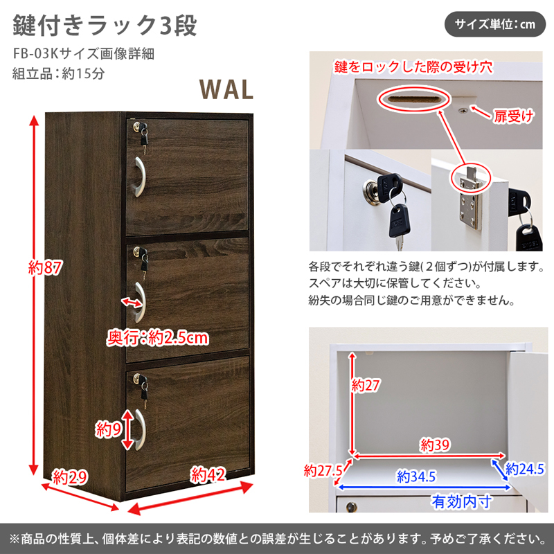 | 商品説明 | 組立品(15分) 扉付きでほこりや日焼けからガードできる優れもの! 各段ごとに施錠が可能! 雑誌や小物の収納、整理に便利!使いやすいラックで本棚や電話台にも。 格段ごとに閉じられる鍵付きラック3段。 大事な物の保管やプライベート保護に役立ちます。 ※1 鍵はスペアを含め2個ずつ付属。各棚ごとに異なるため大切に保管してください。 ※2 複数台お買い上げいただいた場合、鍵の種類は多数ございますが、 重複してしまう可能性もまれにございます。 状況によっては鍵部分の交換を承れない場合もございますので予めご了承ください。 |