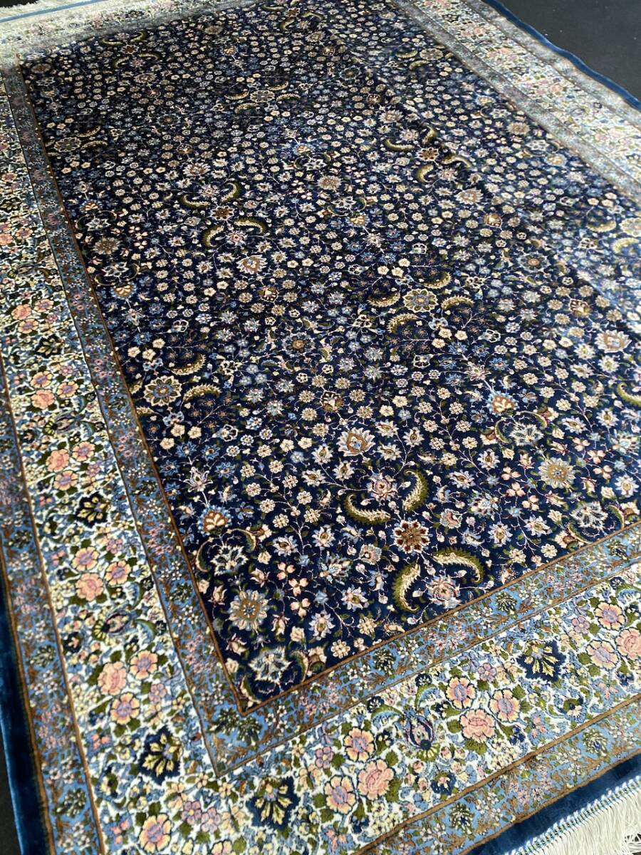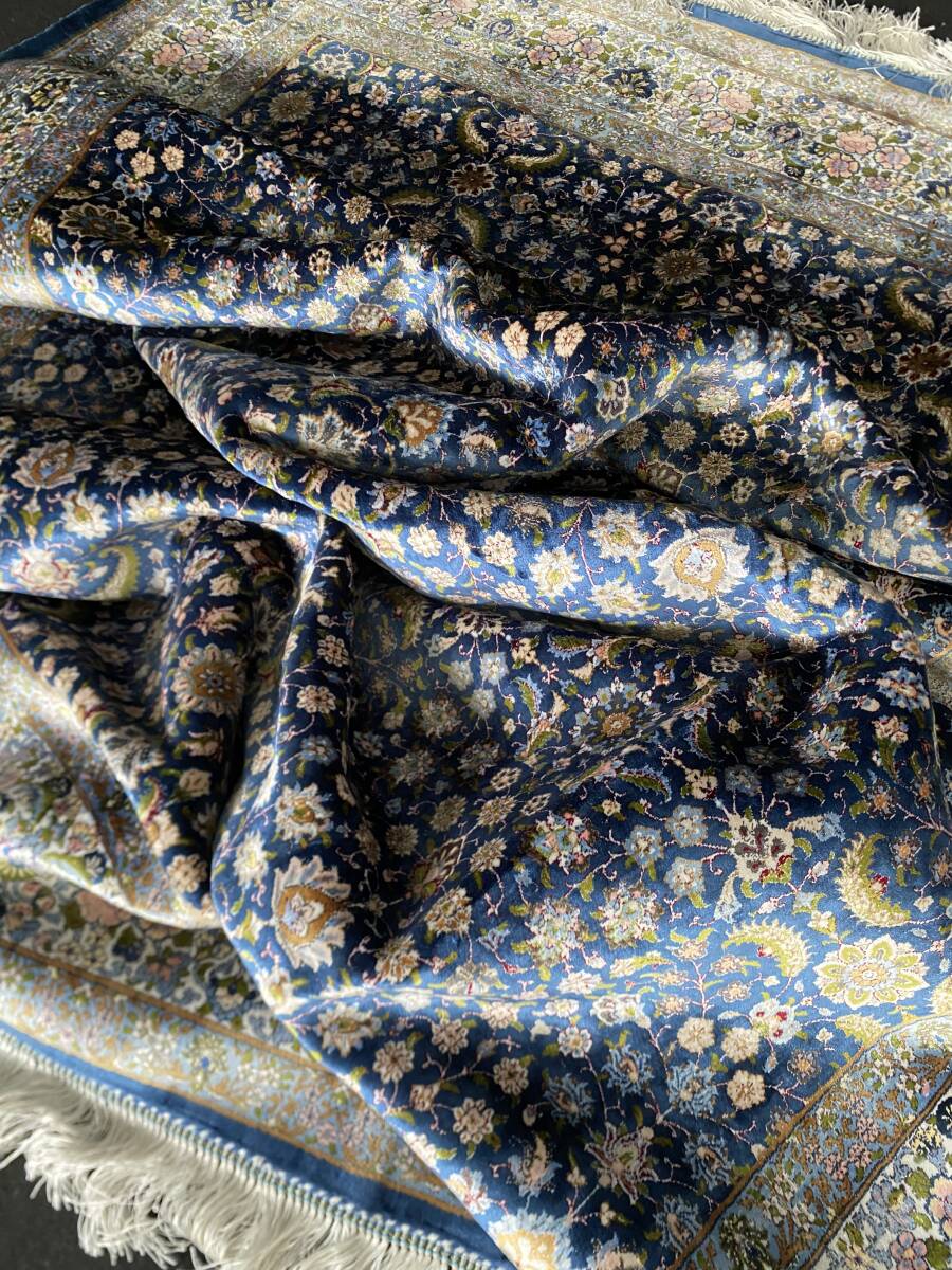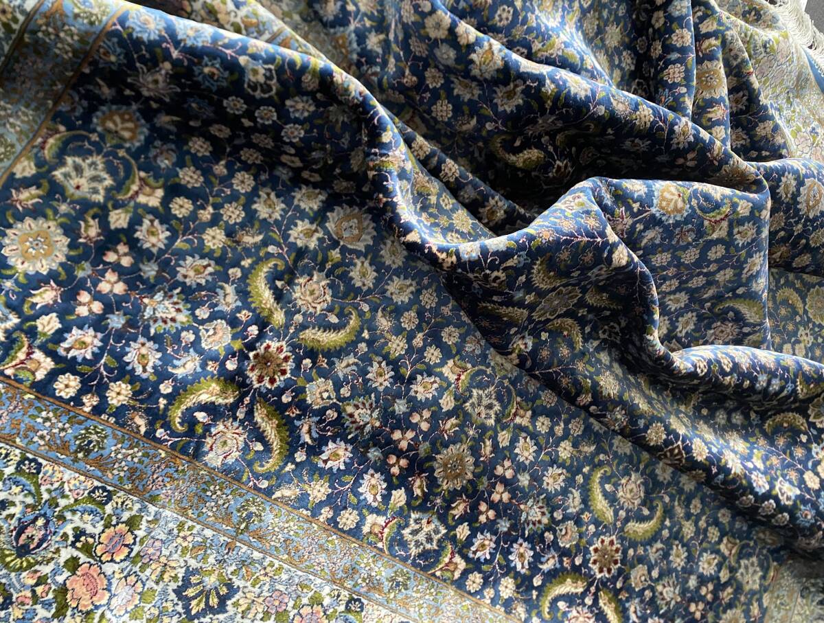 クム絨毯の歴史は1930年頃からと浅く、最初はウール絨毯を、後にシルク絨毯を織るようになりました。絹の産地としても有名なクムで、現在作られるほとんどの絨毯は100%シルク製です。