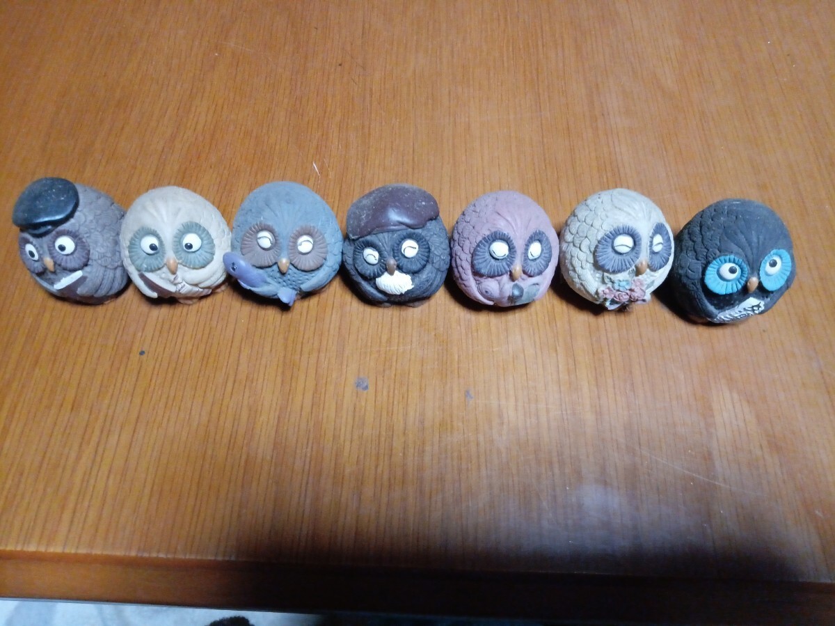 手作り風の多色フクロウ置物7個セット。