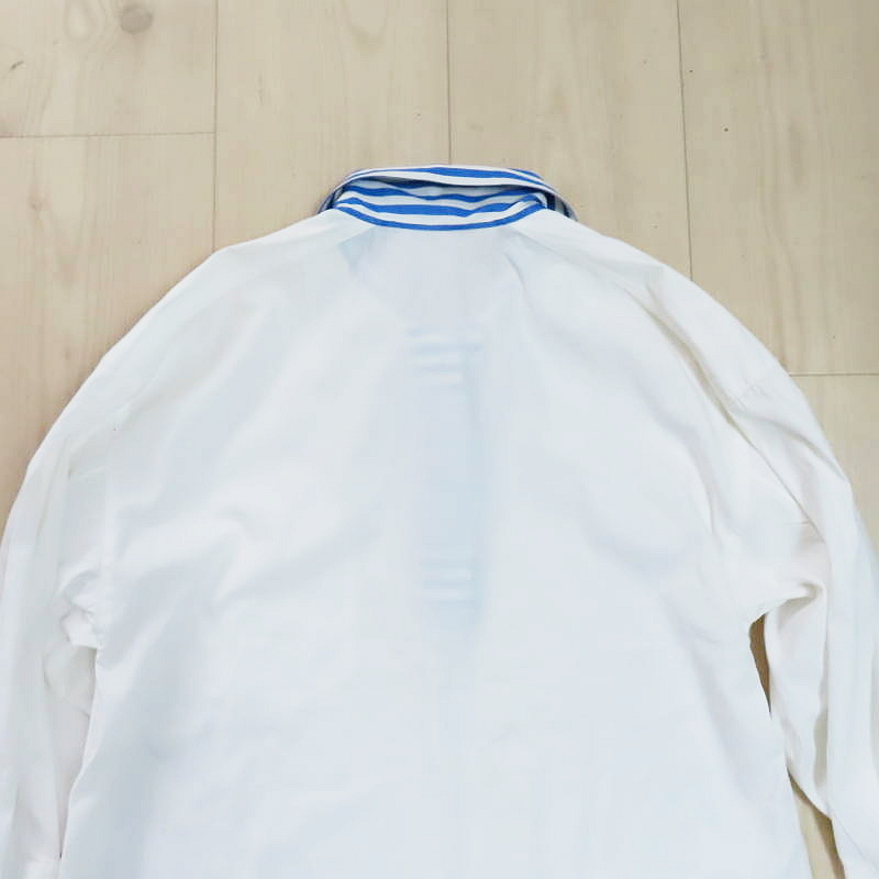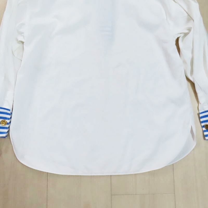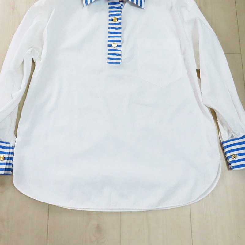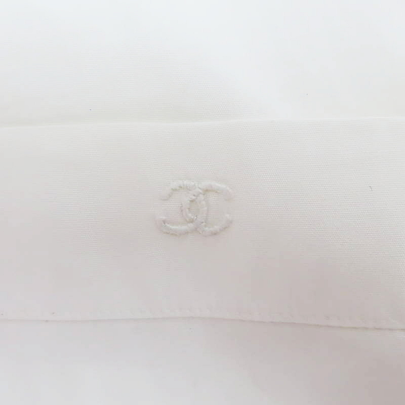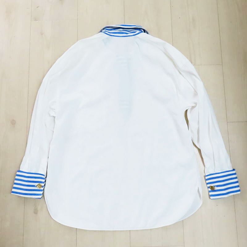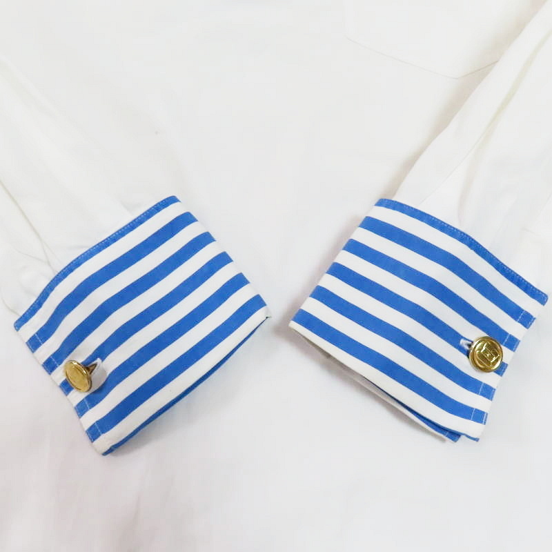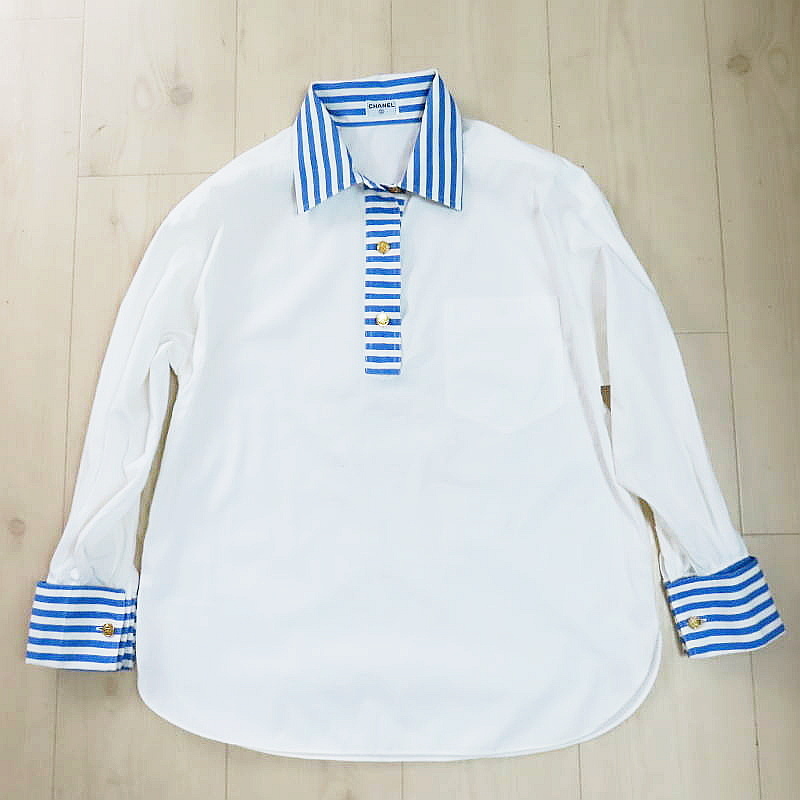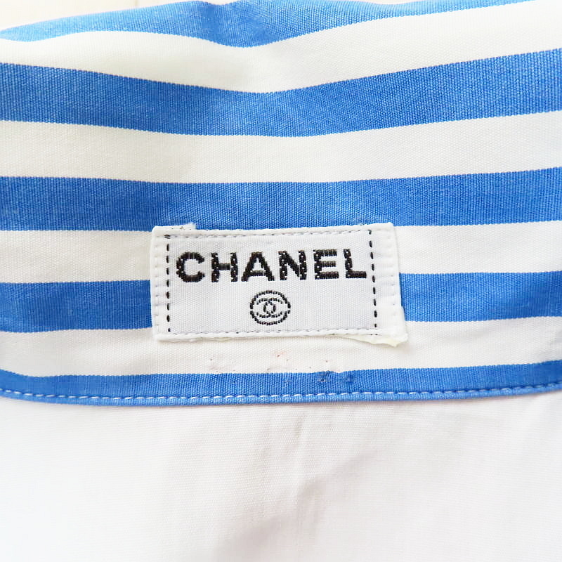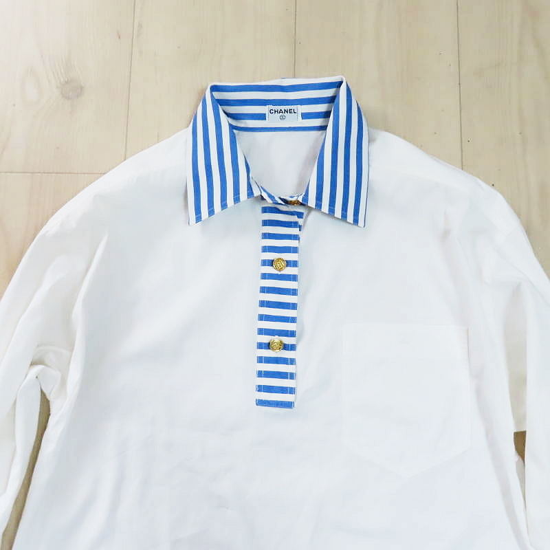 商品名:CHANEL シャネル ストライプ ココマーク/マトラッセ柄ボタン カフスボタン付き ポロシャツ ホワイト/ブルー