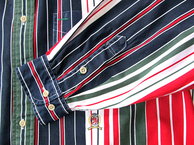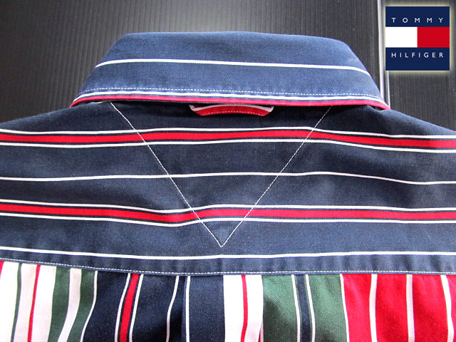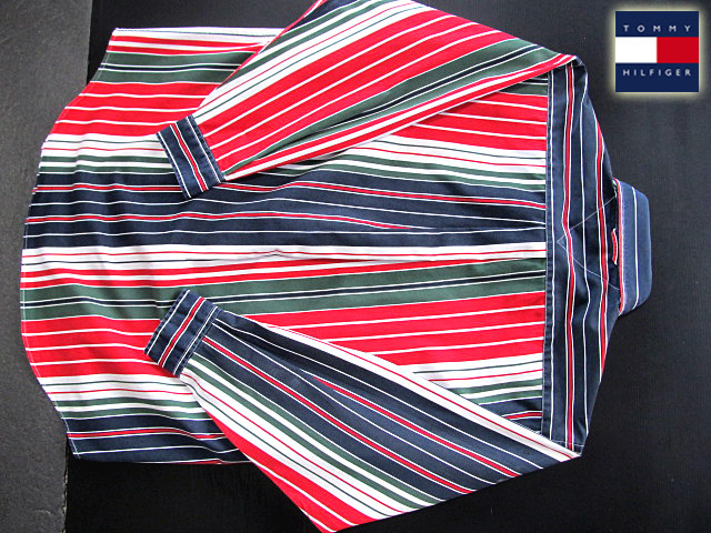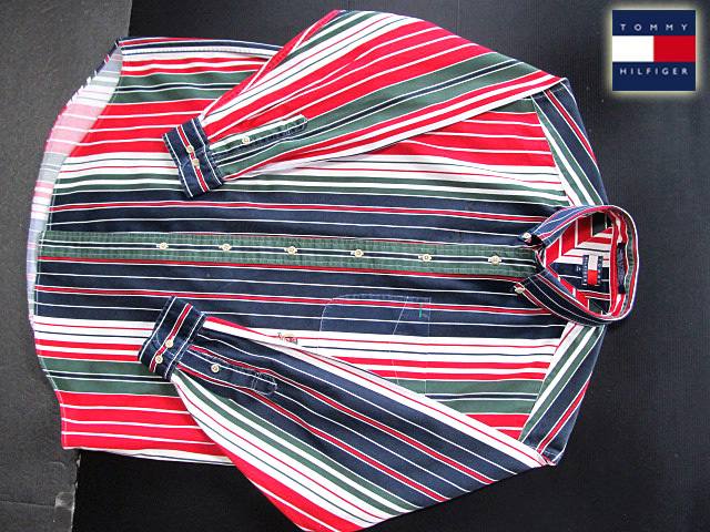 ★100円スタート!トミーヒルフィガー TOMMY HILFIGER ボタンダウンシャツ 長袖 Lサイズ 希少品 マルチストライプ ネイビー×グリーン