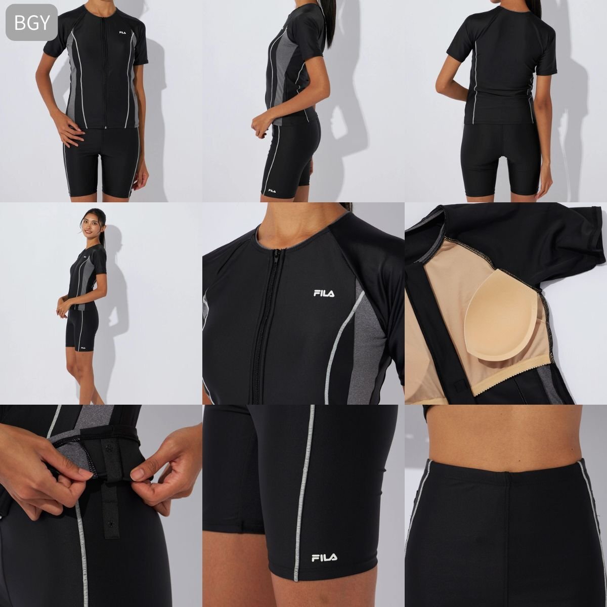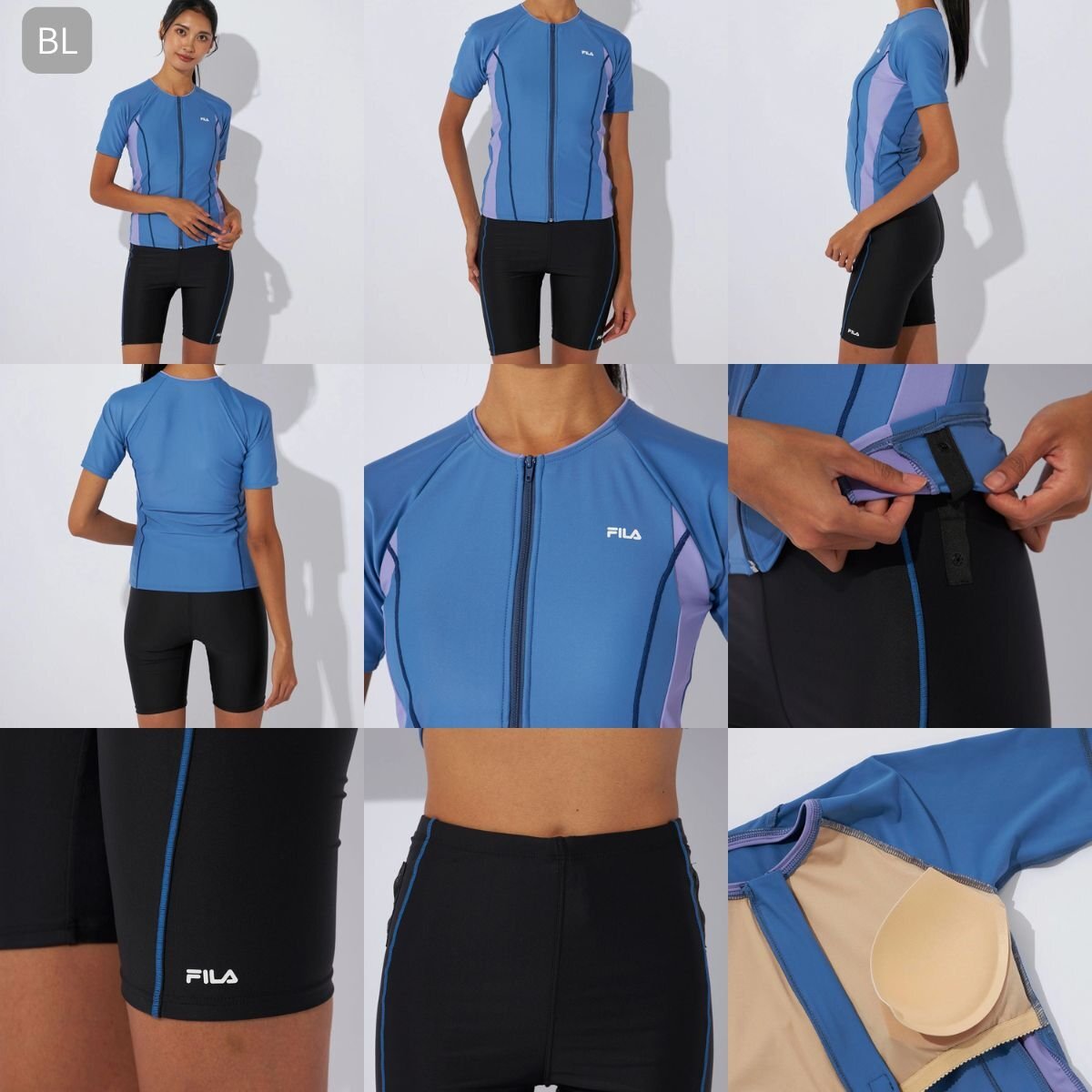 詳細 | 【商品名】 レディース フルジップ 半袖 フィットネス水着 【カラー】 BGY BL BPK GMT NV 【素材】 ポリエステル 85% ポリウレタン 15% 【特徴】 ファスナー付で着脱楽チンなセパレーツ水着。 お好きなカップに取替えできる挿入カップ式。 めくれ防止機能付。 股下:約19cm |