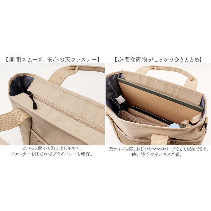 商品説明 | ・・【ママのお出かけを優しくサポート】 ・現役ママ監修☆機能的で、お出かけがラクになる「ママラクメッシュポケット2WAYバッグ」。 ・【シーンを選ばず気軽にヘビロテ】 ・表地は、軽量で丈夫なポリエステル生地。体に負担をかけず、アクティブに動く日も快適。 ・(※1)撥水加工は施しておりません。 ・【お好みに合わせてスタイルチェンジ】 ・手持ちではもちろん!長さ調節可能なショルダーで、肩掛けや斜め掛けも自在な2WAY仕様。 ・【開閉スムーズ、安心の天ファスナー】 ・ガバっと開いて取り出しやすく、ファスナーを閉じればプライバシーも確保。 ・【必要な荷物がしっかりひとまとめ】 ・B5サイズ対応。おむつやママのポーチなども収納できる、使い勝手の良いサイズ感。 ・【サッと取り出せて迷子知らず】 ・内側・外側合わせて9つのポケットを配置。ボトルポケットは、簡易保冷・保温機能付き。 ・【安定感のある舟形フォルム】 ・底がしっかりとしたつくりで、型崩れしにくい!荷物を入れていない状態でも自立。 ・【内生地抗菌・防臭加工でいつも清潔】 ・色んな物を詰め込む、バッグの気になる匂いを軽減。匂いの元となる菌も増殖しにくく衛生的。 ・【簡単装着◎ベビーカーストラップ】 ・ベビーカーや車の座席に掛けられる、2本のストラップ。面ファスナーでグルっと巻くだけ。 ・(※2)両サイドにDカン付き。 ・【長く使えるシンプルデザイン】 ・ベーシックカラー&シンプルデザイン。マザーズバッグ卒業後も大活躍♪ ・【ポケット仕様】 ・内側:ファスナーポケット×1、オープンポケット×3、ボトルポケット×1(内側アルミ素材) ・前面:メッシュポケット×1 ・サイド:メッシュポケット×2 ・背面:メッシュポケット×1 |
