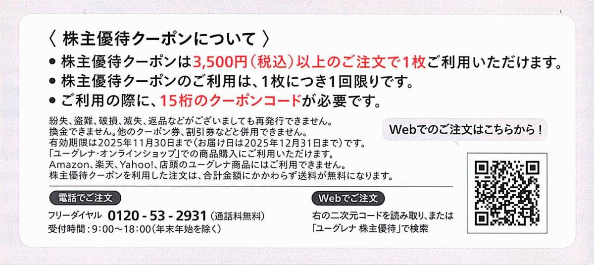 「ユーグレナ 株主優待券【2000円券】」 / 番号通知のみ / 有効期限2025年11月30日