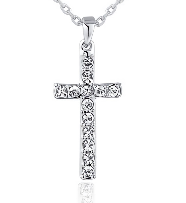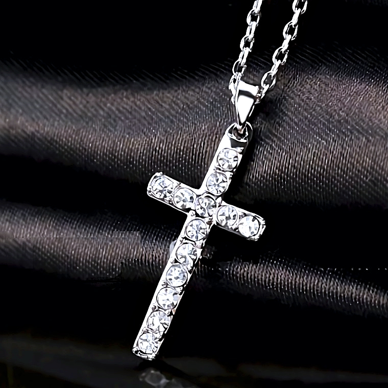 こちら眩しい輝きを放つオシャレな七色ダイヤモンド十字架クロスプラチナ仕上げシルバーネックレスです。