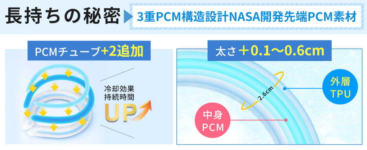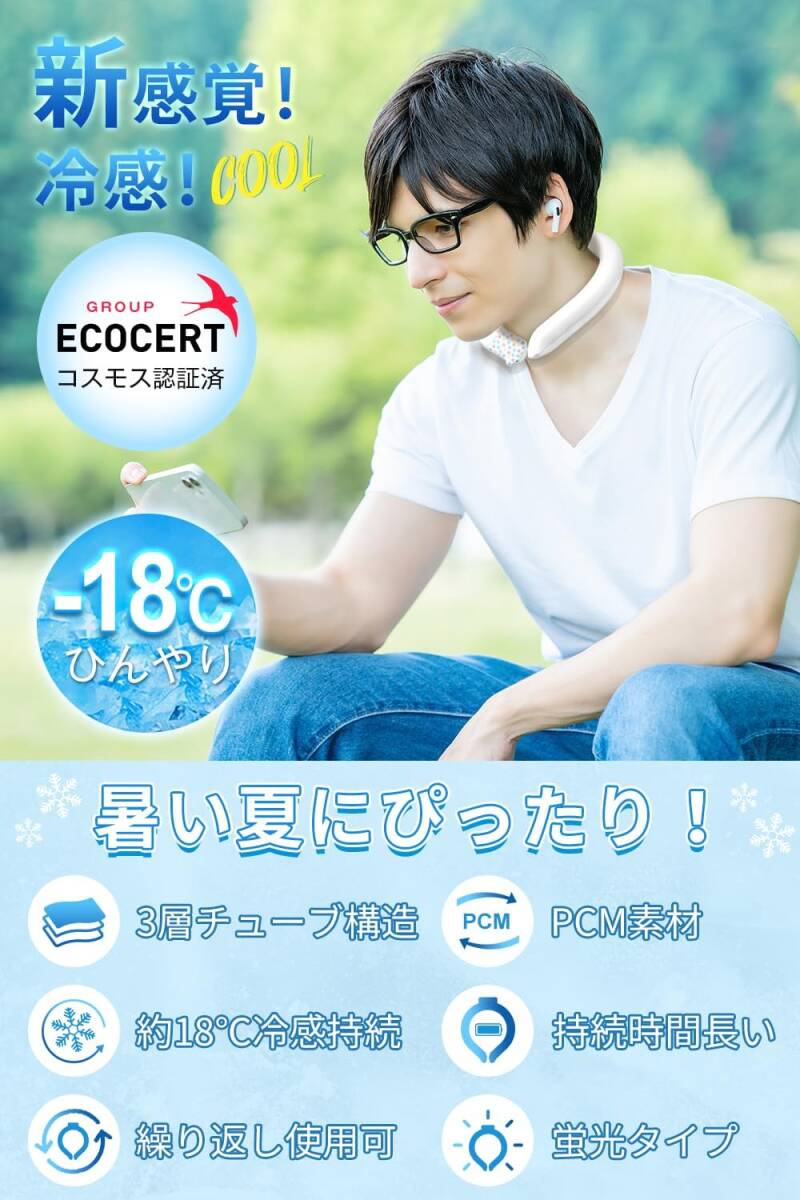 温度変化に応じて熱を吸収・放出するPCM素材を使用しています。周囲の温度が上昇しても、一定の温度で安定するのが特長です。25mm幅の接触面が肌にしっかりと密着し、効率よく冷却します。COSMOS・RoHS・REACHといった国際的な安全基準をクリアしており、安心して使用できます。