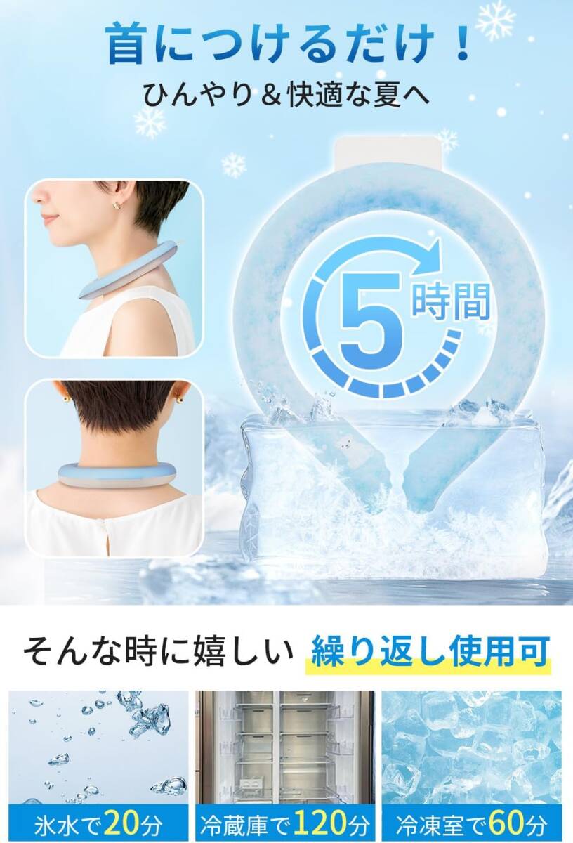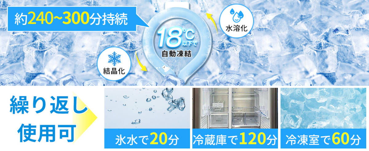 冷凍庫で約30分、氷水で約10分冷やすだけで使用でき、使っても結露しにくいため、衣類や髪を濡らす心配がありません。18℃以下で自然に凍るので、涼しい場所に置くだけで再凍結し、繰り返し使えます。環境にも配慮された設計で、長く使い続けられます。