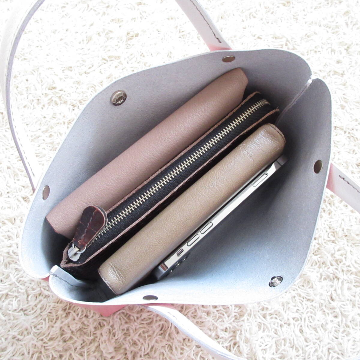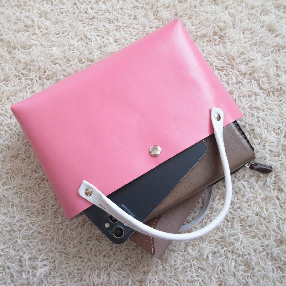 ◎綺麗なピンクにホワイトのハンドルやシルバーの金具を合わせ華やかに仕上げました(^^/