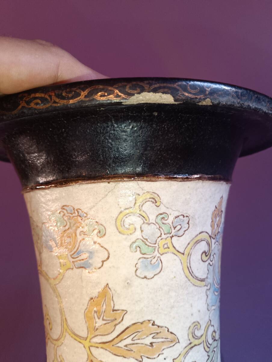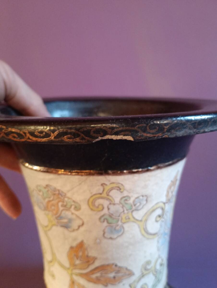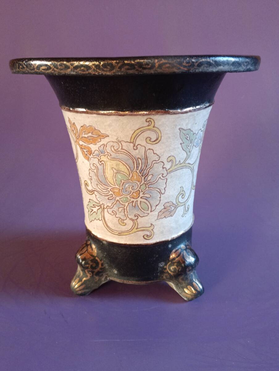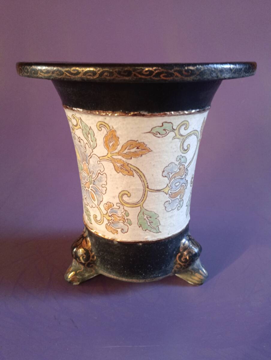 白胴に唐草文、美しい瑞花を描いた京都短冊屋製万年青鉢です。金泥による装飾、加茂黒の釉薬と大変希少な品です。残念ながら、縁にカケ、そこからヒビが入っております。