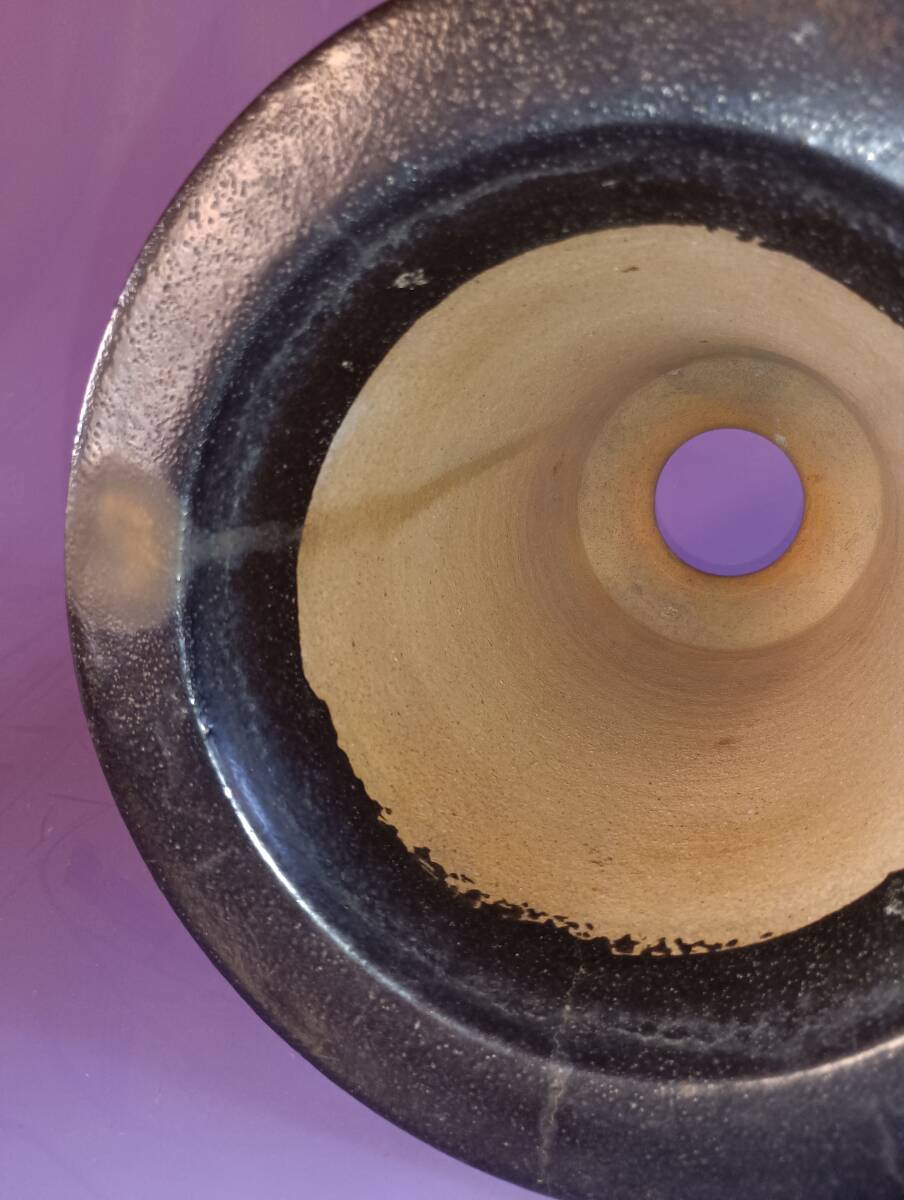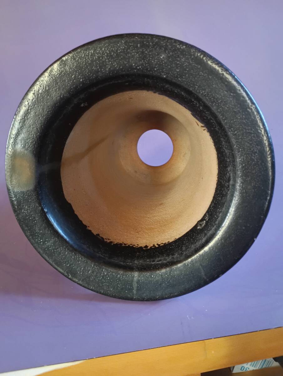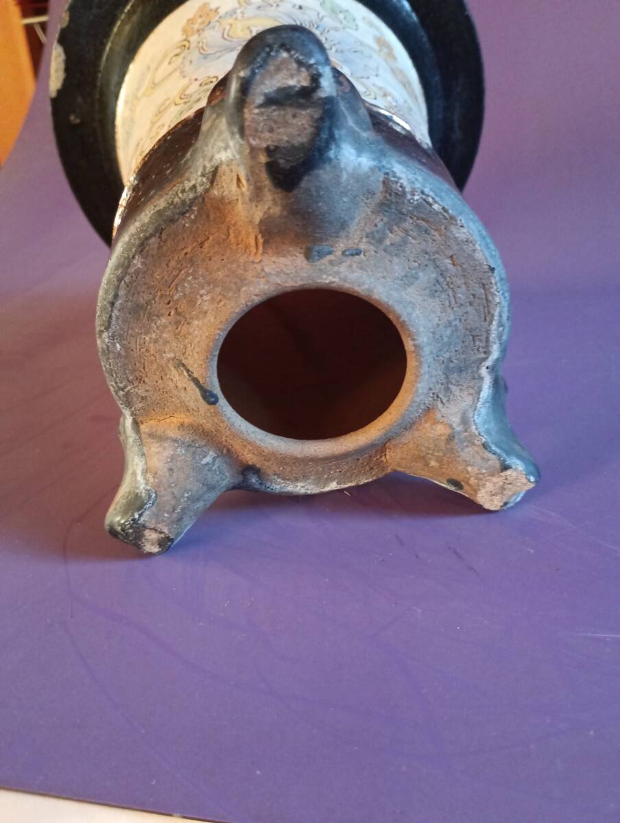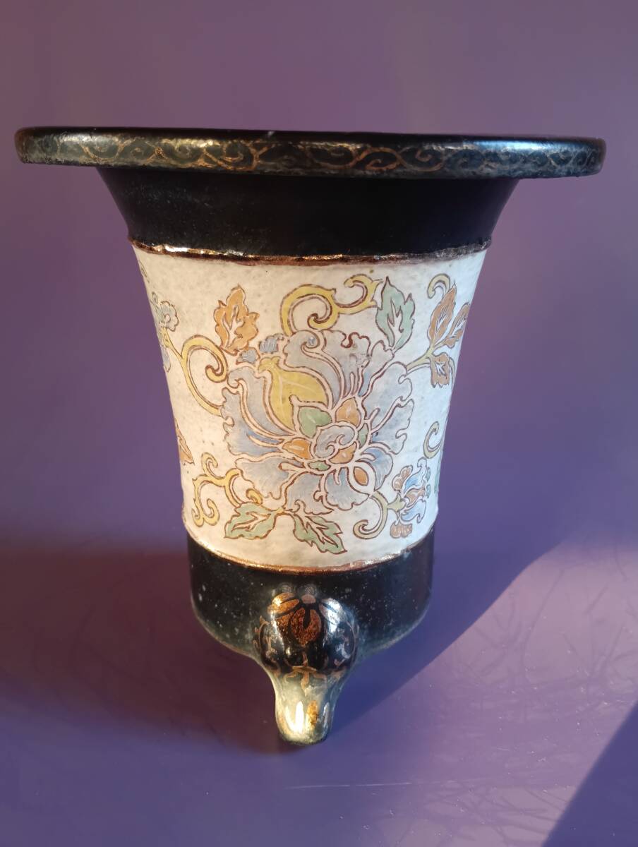 白胴に唐草文、美しい瑞花を描いた京都短冊屋製万年青鉢です。金泥による装飾、加茂黒の釉薬と大変希少な品です。残念ながら、縁にカケ、そこからヒビが入っております。