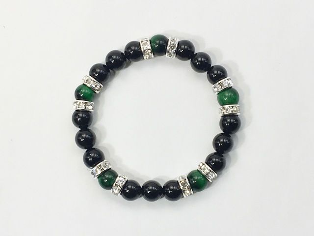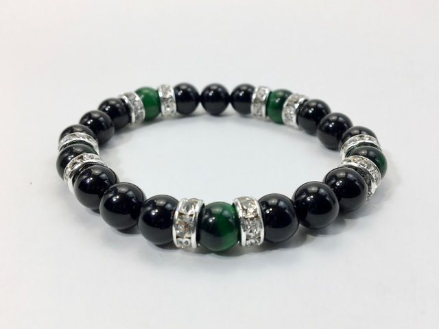 こちらは、8mm玉のオニキスとグリーンタイガーアイを使ったパワーストーンブレスレットです。シンプルなデザインでどんなコーディネートにも合わせやすいデザインに仕上げています。サイズは内周約15cmです。気になる方は是非この機会にどうぞ。