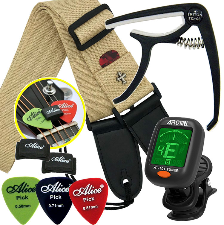 ★5点セット★ カポタスト&クリップ式 チューナー(電池付)&コットンストラップ(白)&ラバーピックホルダ(2個)&ピック(3枚)