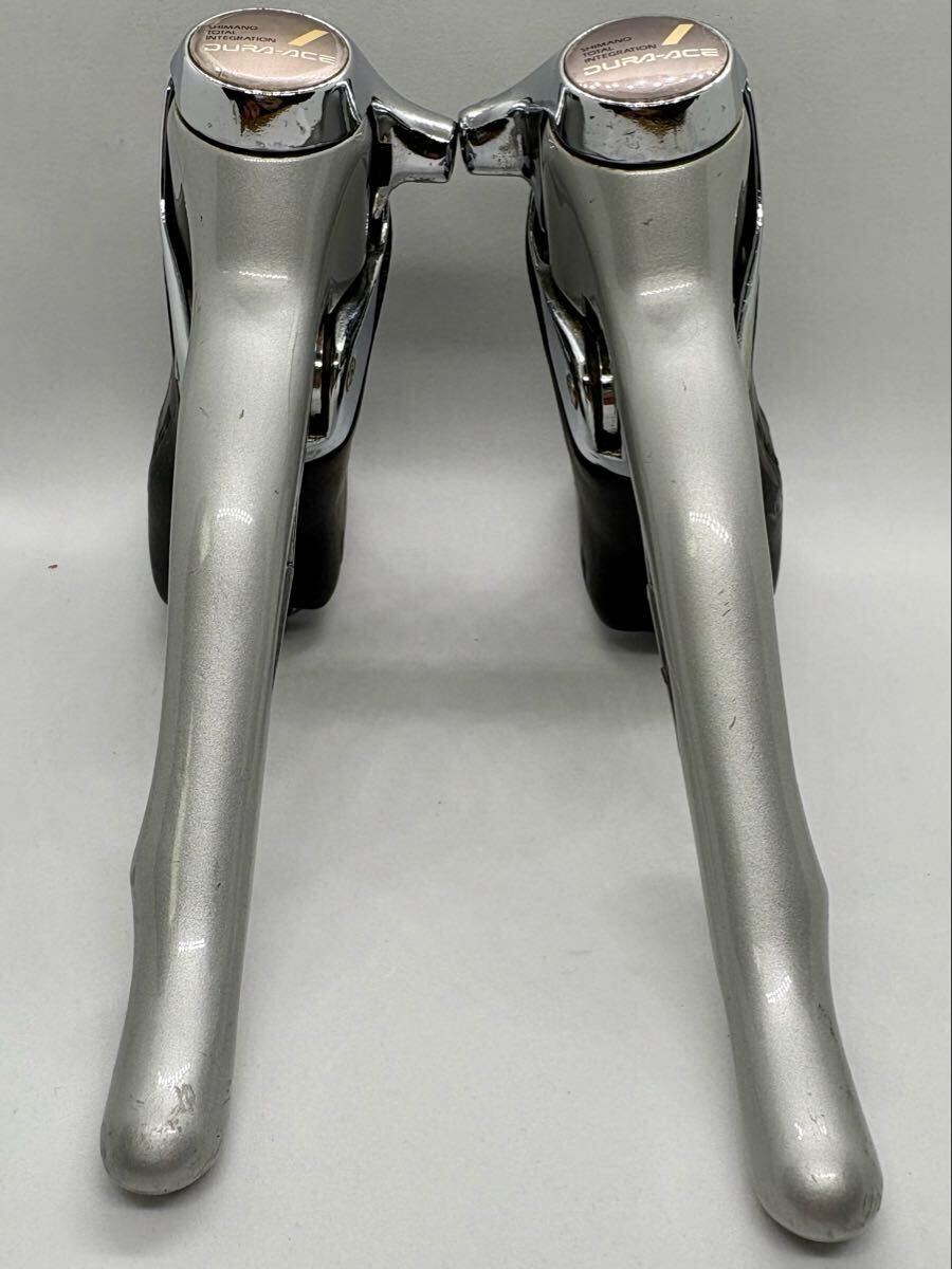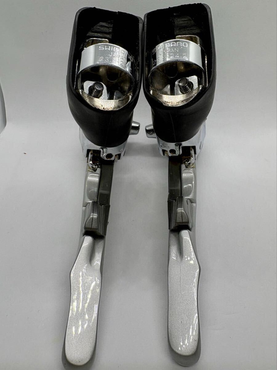 コンポの歴史を変えた名機: シマノの最高級コンポーネントであるデュラエースの初期型STIレバーです。シンプルな構造ながら、当時のDURA-ACEらしい高い操作性と精密なクリック感は今なお多くのファンに評価されています。