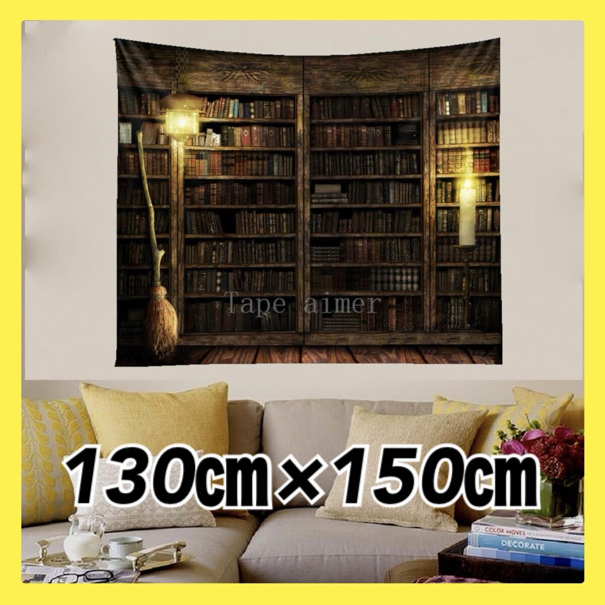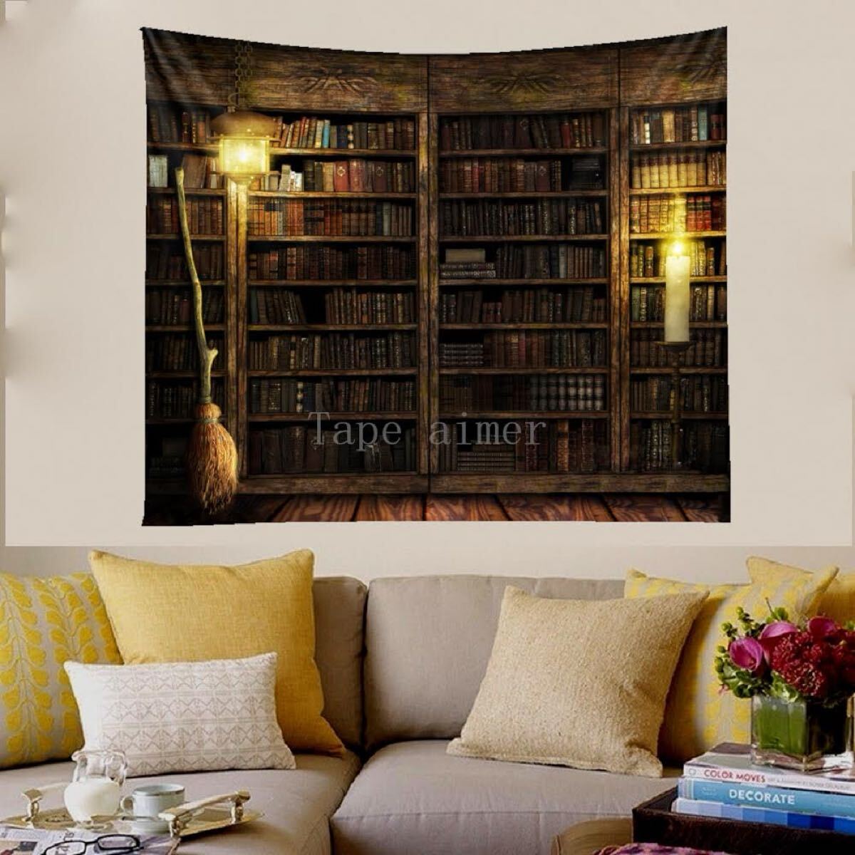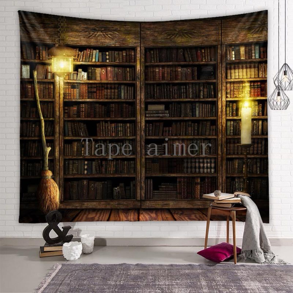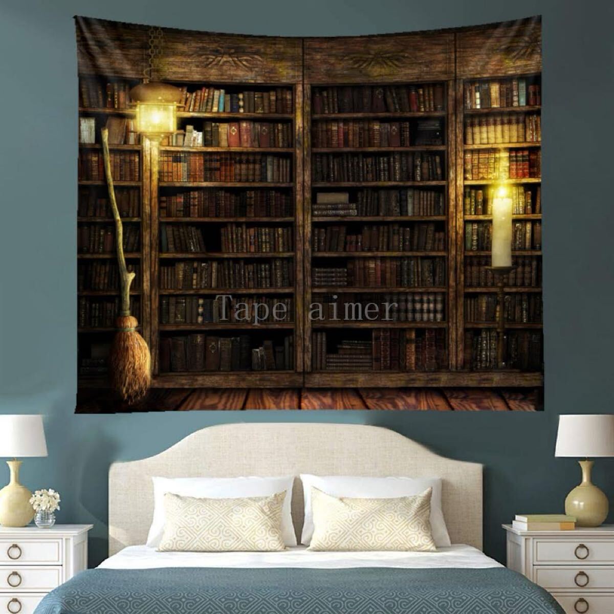 暗闇の中に本棚とほうきが佇む、ミステリアスな空間を描いたタペストリーです。