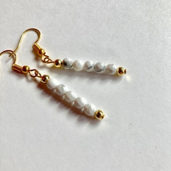 こちらは、4mmのハウライトフックピアスです。今回は石の大きさは4mmを使用して細身なピアスに制作しております。耳元を華やかに飾ってくれるアイテムですので気になる方は是非この機会にどうぞ。