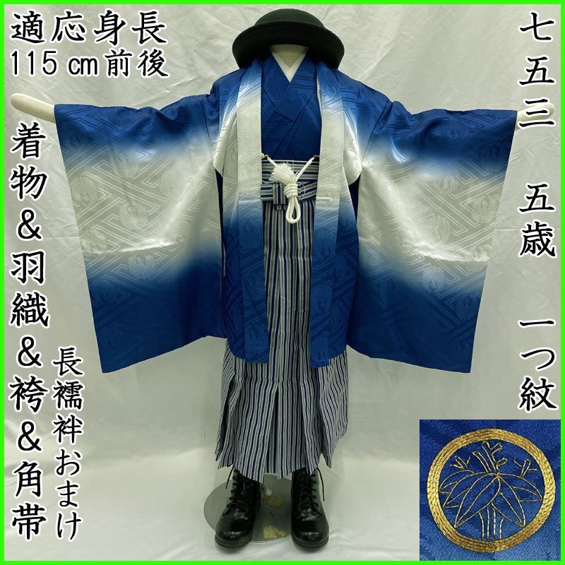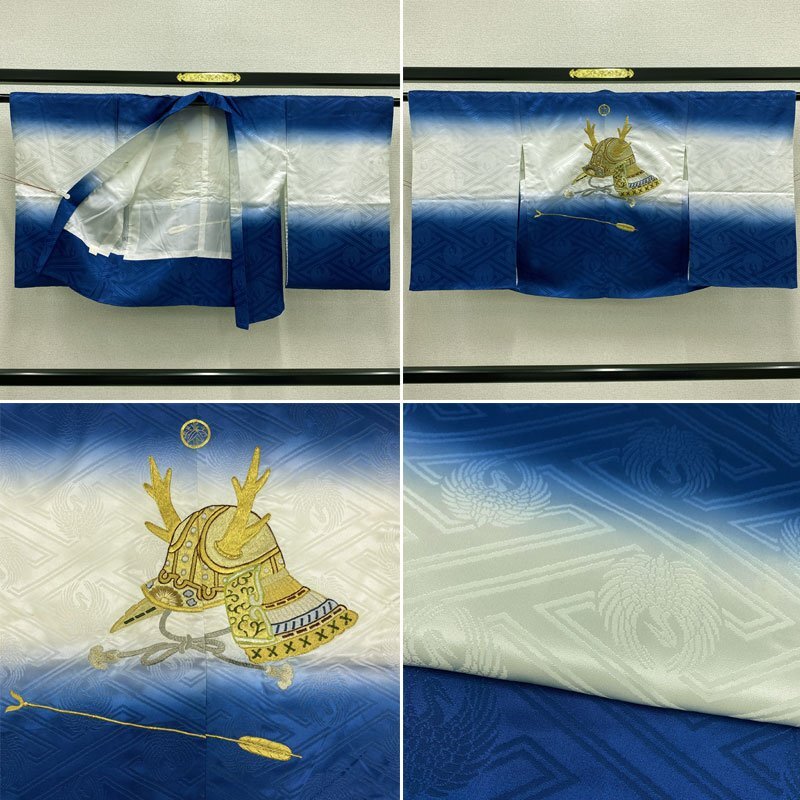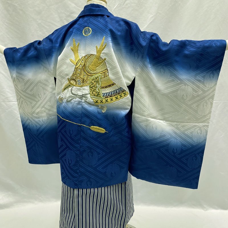 | ◎七五三 五歳 男児 着物&羽織&袴&角帯&長襦袢 濃縹◎美品 (No.gd) こちらの商品は着物、羽織、袴、角帯です。その他の帽子、ブーツはセットに含まれません。 地紋が浮かび上がる濃縹(くすんだ青緑系)の地に、刺繍で施された兜文様が素敵な5歳七五三のお着物セットです。一つ紋(丸に陰若根笹)入り。金糸、金駒刺繍が施されております。 懐剣、羽織紐、末広、草履や足袋などはセットに含まれませんので、ご用意をお願いいたします。 (着物)腰辺りに薄い汚れが線のようにございますが、地の色が濃いので目立たないのと、お着付けで見えません。他にシミ・ダメージなく美品です。 (長襦袢)袖丈に合うものをおまけでお付けいたしますが、中古品のためシミ汚れがある場合がございます(素材はお選びいただけません)。半衿は付いておりませんが、このまま着用いただけます。 (帯)特にシミ・ダメージなく美品です。 【表地素材】(着物)正絹、(羽織)正絹、(袴)ポリエステル、(長襦袢)ポリエステル、(帯)ポリエステル 【色】濃縹(くすみ青緑系) *モニターによって色味は実際と異なる場合がございます。 【サイズ】(着物) 裄:54.1cm、肩上げ:-cm、袖幅:30.1cm、袖丈:56.2cm、丈(肩から):101.3cm、腰上げ:-cm、前幅:18.3cm、後幅:23.9cm (羽織) 裄:54.5cm、肩上げ:-cm、袖幅:30.1cm、袖丈:56.4cm、丈(肩から):62.8cm、腰上げ:-cm、前幅:16.3cm、後幅:22cm (袴) 紐下丈:60cm (帯)幅:5.7cm、長さ:209cm *素人採寸のため、多少の誤差はご容赦ください。 お求め安い価格での出品ですので、いかがでしょうか? | |